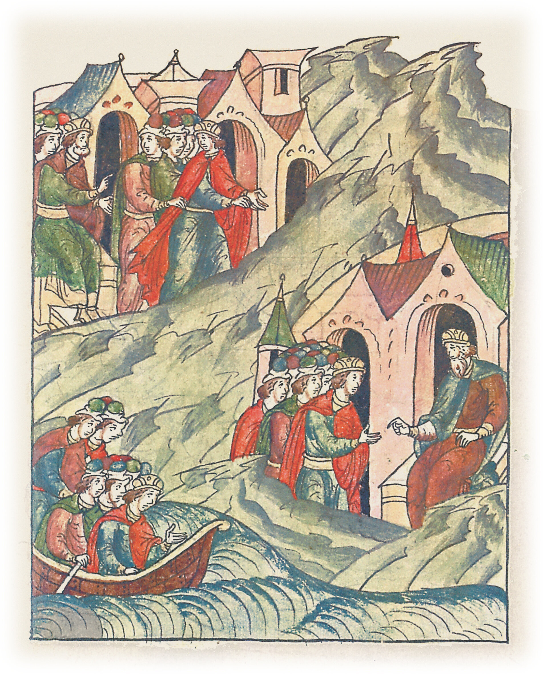 Ругодивские посадники Яким и Захар приезжают в Москву. Воеводы царя Ивана Васильевича Алексей Адашев и Иван Михайлов сообщают им, что государь пожалует их, если сдадут его воеводам помимо Ругодива Вышгород.