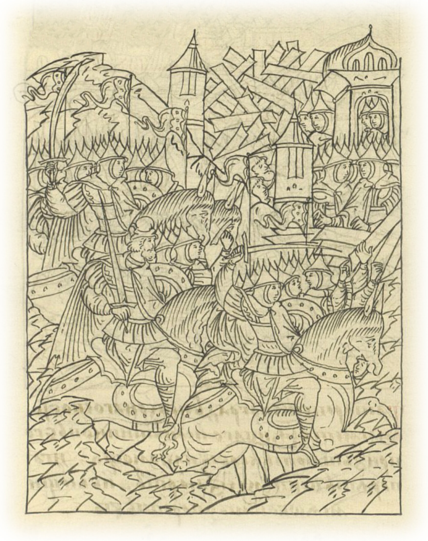 Языки говорят воеводам царя Ивана Васильевича, что магистр окопался большим рвом вокруг города Рындола, бьет из пушек и пищалей и приступает к Рындолу.
