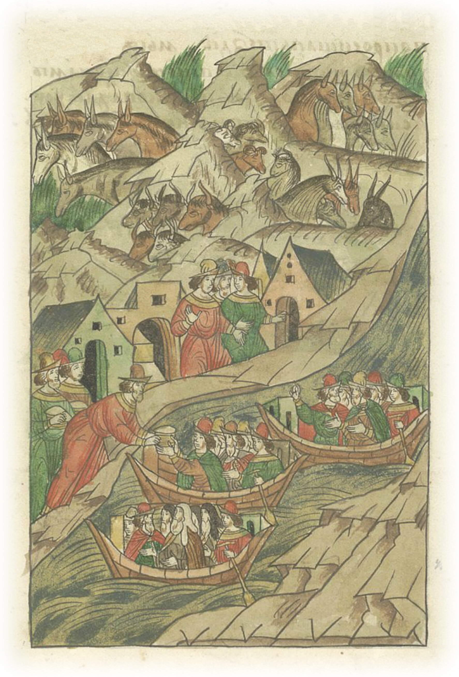 В неделю же шестую о Слепом, плывя, минули Бугин улус, и тут многое множество татар, и многие стада всякого скота без счета. Из татар же никто нас не обидел, только спрашивали нас везде. Мы же отвечали, и они, услышав, никакой нам пакости не творили и молоко нам давали. И так с миром в тишине плавали.