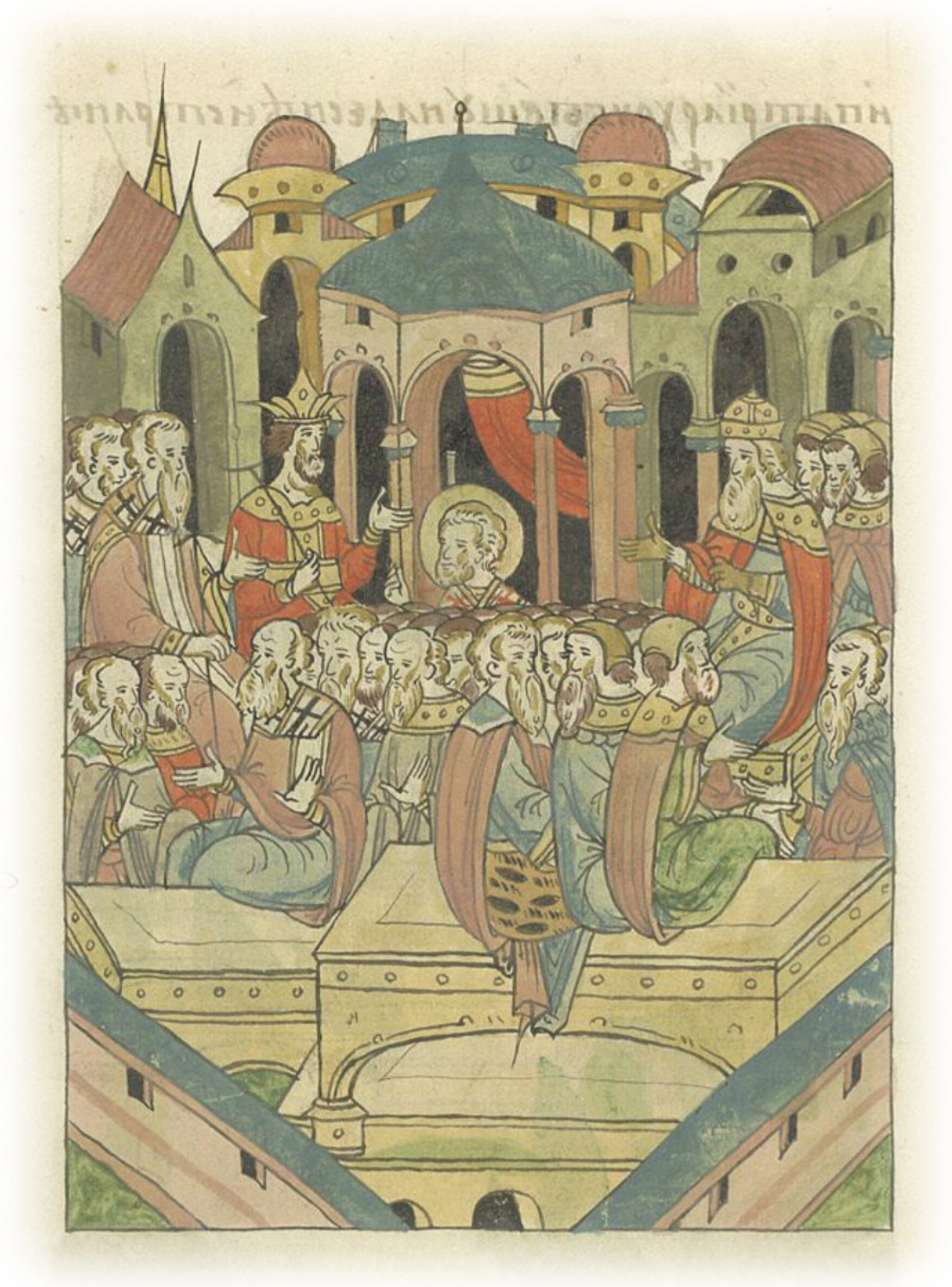 И за стол для философсов были посажены мудрецы: Юлиан, кардинал Римский, а с ним греки Иоанн Болонский, Адриан Критский; а за столом для богословов перед царем – Марк, митрополит Эфесский, вместо патриарха Алесандрийского, а митрополит Исидор вместо патриарха Антиохийского, а Виссарион Никейский вместо патриарха Иерусалимского.