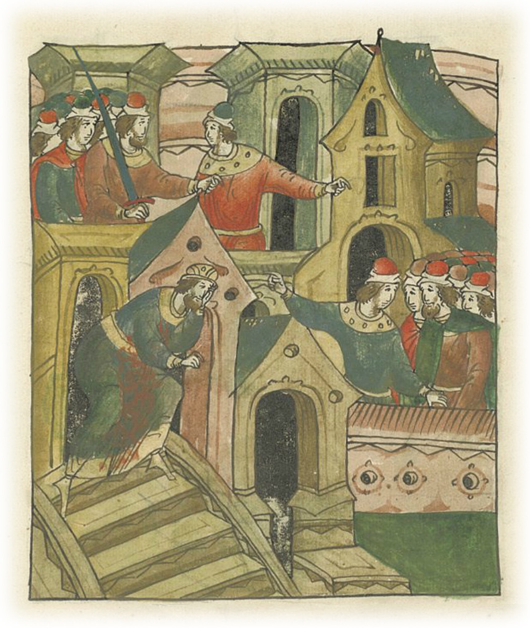 Убийство великого князя Андрея Юрьевича Боголюбского во Владимире Кучковичами. Раненый князь идет под сени, убийцы ищут его.