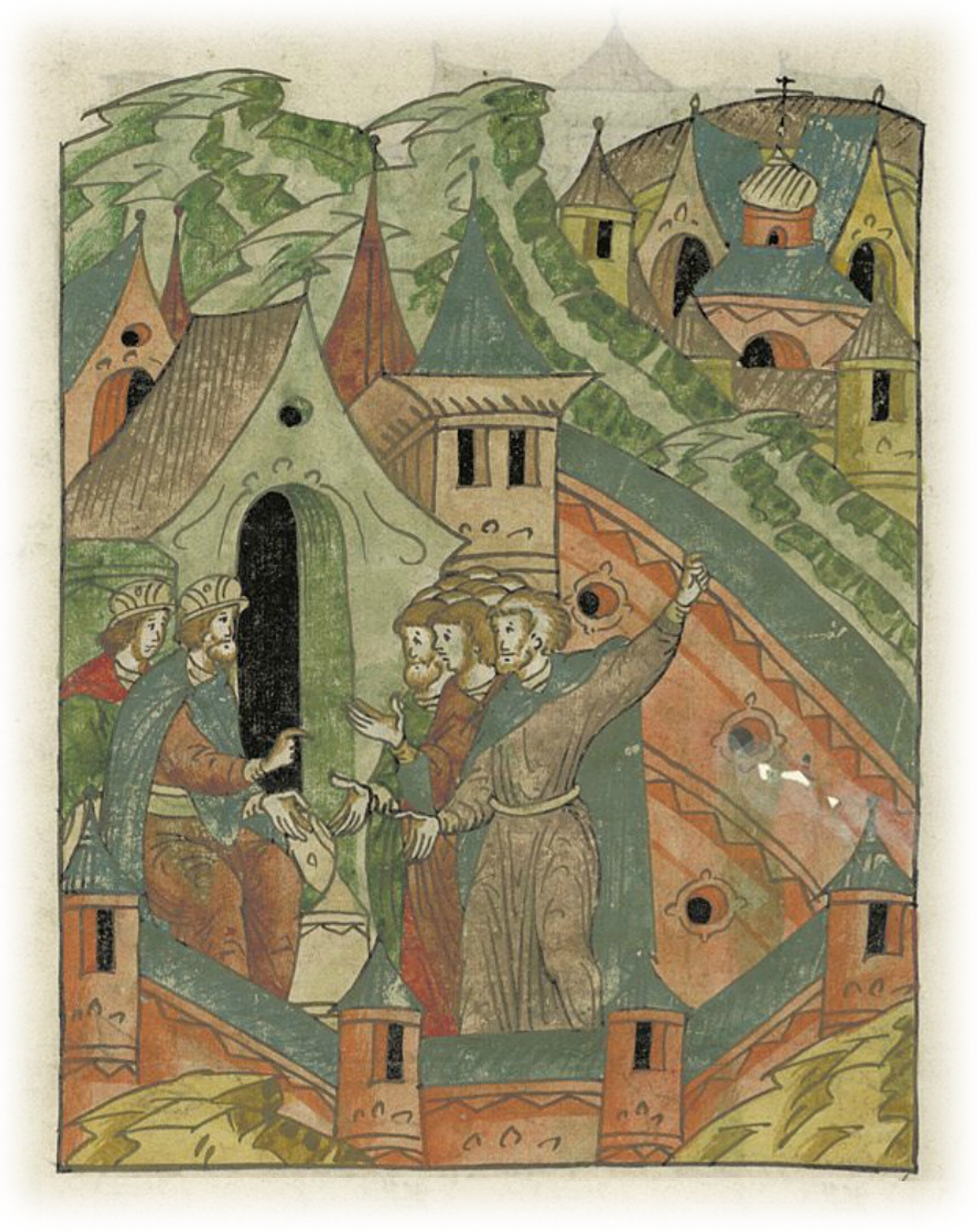 О новгородцах. В ту же осень пришли лучшие из новгородских люди, дружина Мирошки, к великому князю Всеволоду с челобитьем и мольбою, со многими дарами от всех новгородцев, говоря: «Отчина твоя и дедина Новгород Великий просит у тебя сына на княжение в Новгород».