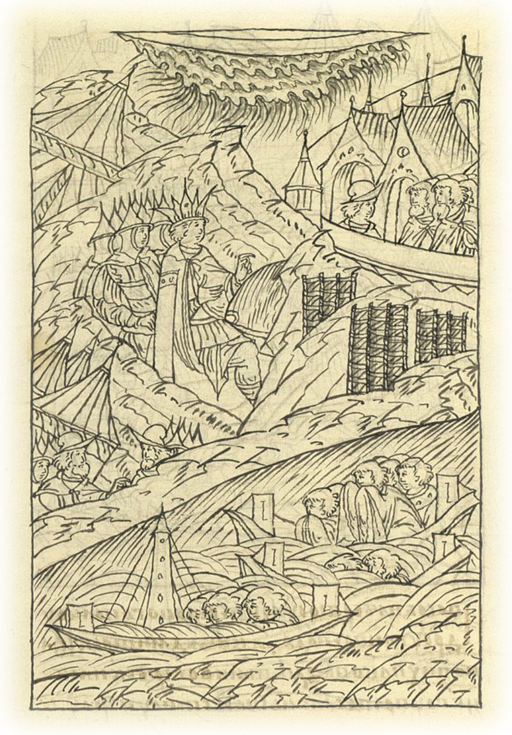 Шатер государя Ивана Васильевича и другие шатры в полках падают из-за сильной бури, а также разбиваются многие суда с царскими запасами.