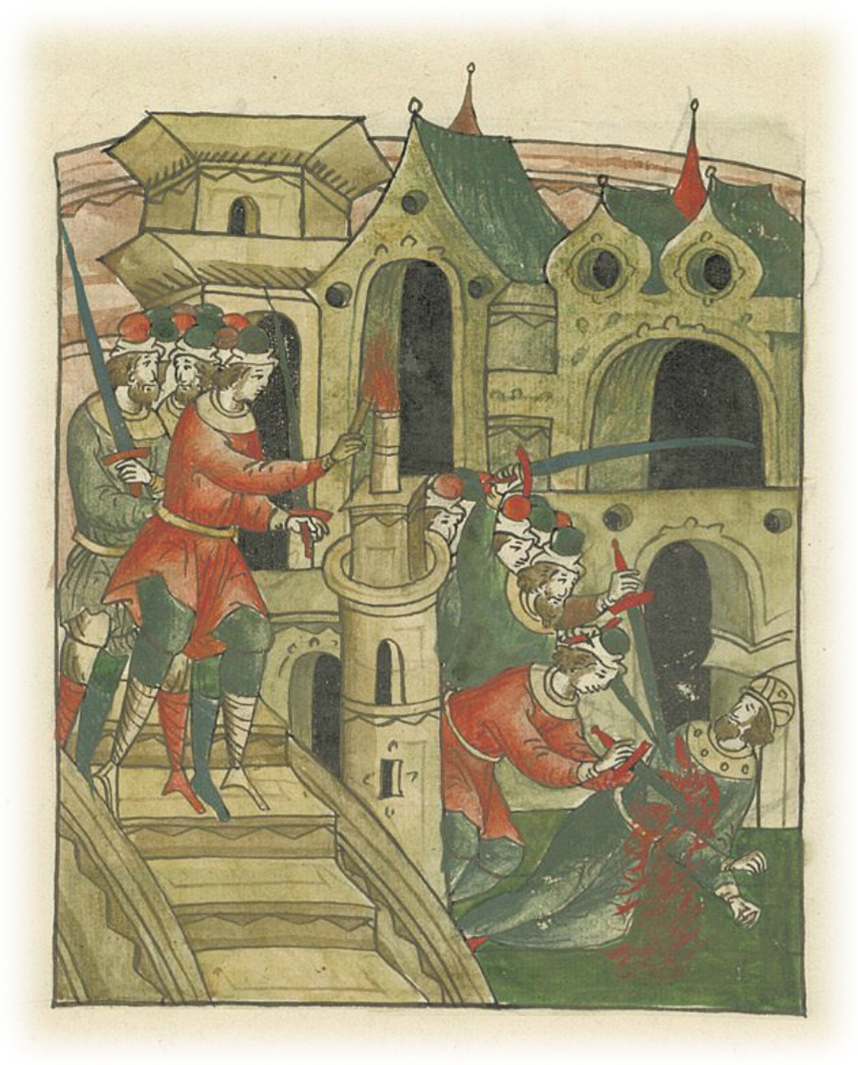 Убийство великого князя Андрея Юрьевича Боголюбского во Владимире Кучковичами. Убийцы по кровавому следу находят раненого князя и убивают его. Петр отрубает ему правую руку, остальные пронзают его мечами.