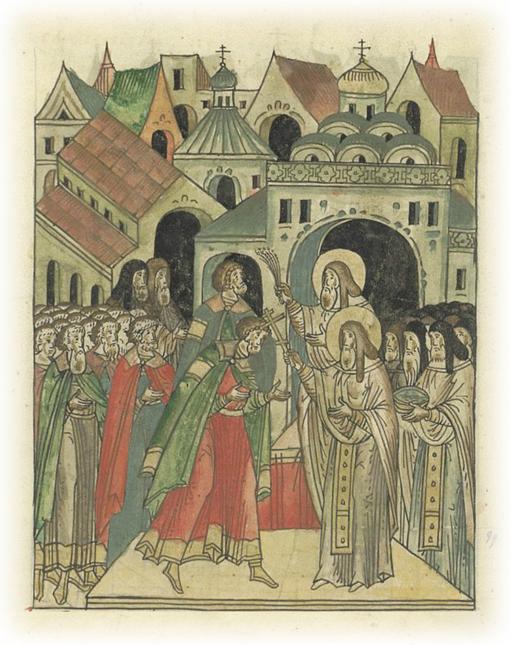 И благословил крестом, и окропил освященною водою великого князя и тех своих двух иноков, Пересвета и Ослябя, и всех князей, и бояр, и воевод.