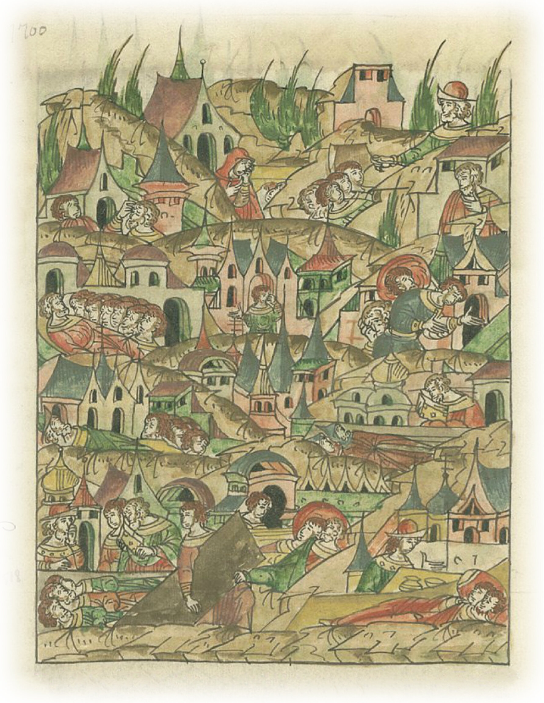 В том же году был страшный мор в Великом Новгороде, в Пскове, в Ладоге, в Русе, Порхове, Торжке, Твери, Дмитрове, по всем землям и селам. И настолько был свирепый мор, что живые не успевали хоронить умерших, не хватало людей помогать болеющим, один здоровый человек десяти и двадцати больным служил. И во всех тех местах люди умирали каждый день, живые не успевали хоронить умерших до захода солнца. Многие села опустели, в городах и посадах едва ли оставался в живых один человек или ребенок. Как будто серп жал людей, как колосья в поле, все большие дворы опустели: едва из большого количества людей выживал один или двое, а где-то оставался в живых только один ребенок. Вот признаки этой болезни: сначала будто бы рогатиной ударяло у человека под лопатку или напротив сердца, или под грудью, или между плеч, или в паху, или за пазухой, разболевшись, человек начинал кашлять кровью и был охвачен жаром, как огнем. После этого человека бросало то в пот, то в дрожь, так проходил по всем частям человеческого тела этот недуг. Нарыв на теле бывал в разных местах: у одного – на шее, у другого – на бедре, у кого – под пазухой, а у кого – за лопаткой, у одного – под скулой, а у другого – в паху или в каких других местах. И, немного пострадав, много людей умирало с покаянием, некоторые же принимали ангельский и иноческий чин, и так уходили из этого мира. Милосердный Бог показывал свою ярость и гнев вместе с милостью.