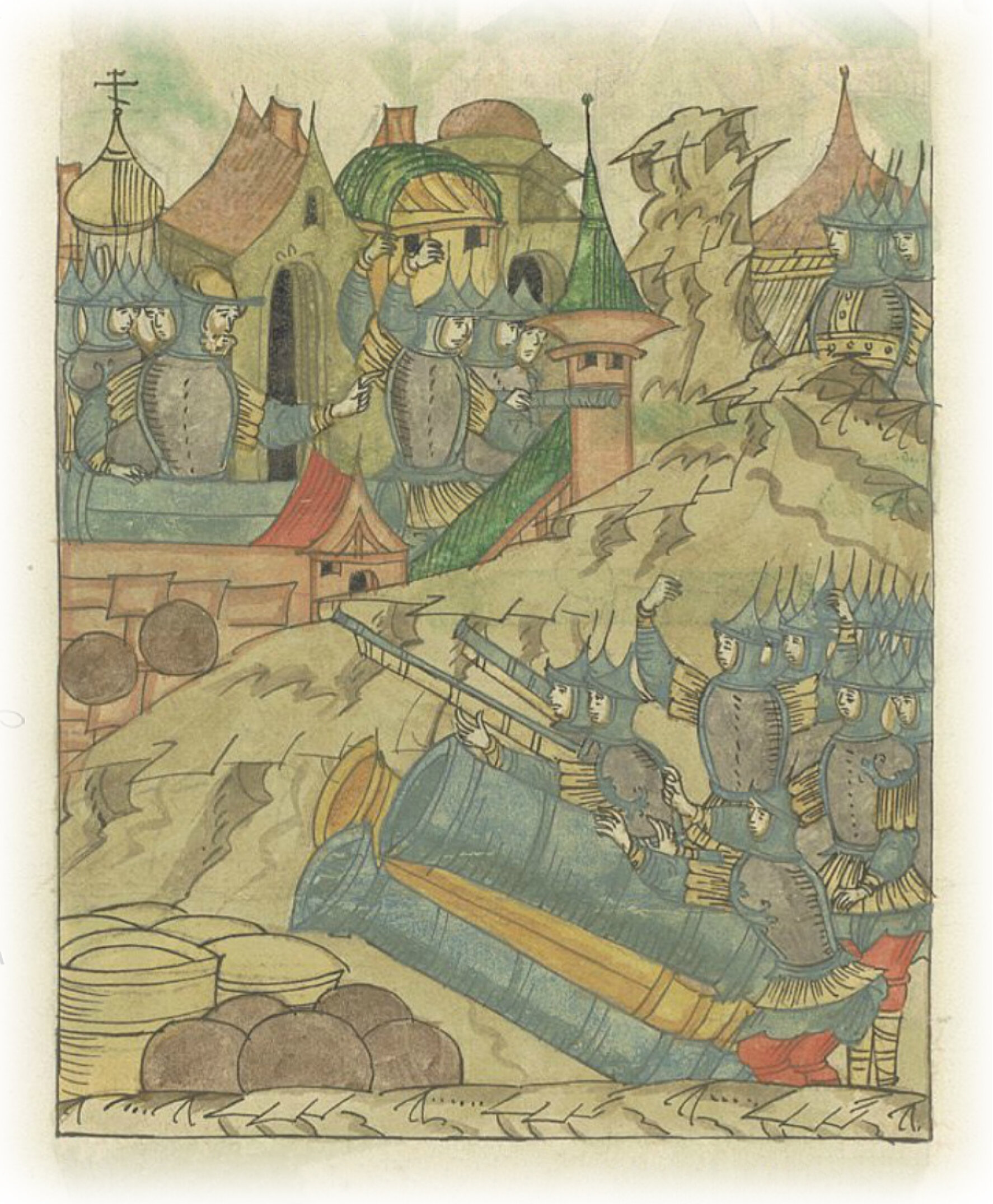 А против Зустунея навели большую пушку, потому что на том месте стена городская была ветха и низка; и когда ударили по тому месту, стена заколебалась, и еще второй раз ударили и сбили со стены верх саженей пять; а третий же раз не успели, наступила ночь.