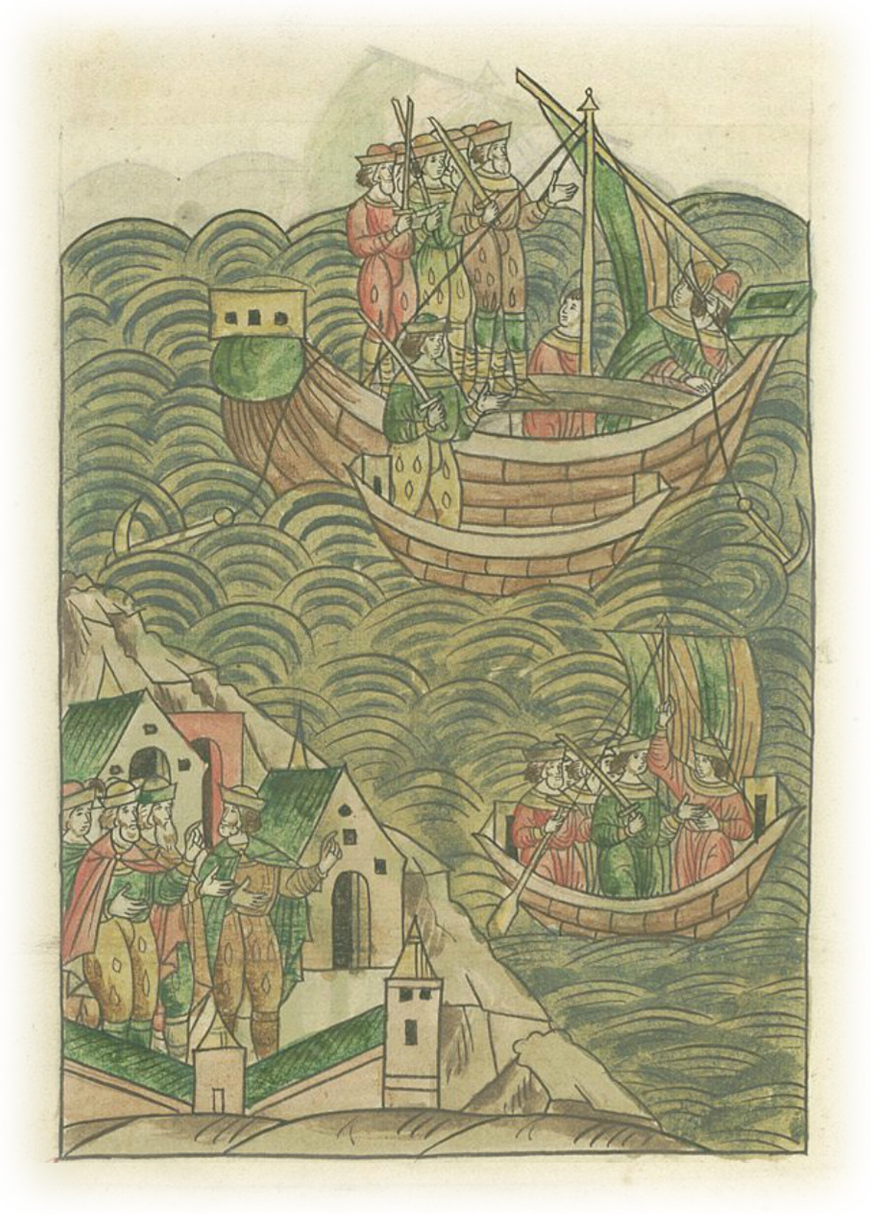 И было, в полночь корабль стоял на якорях. И некие в городе оклеветали нас перед фрягами, и догнали нас фряги в сандальцах*, и заскочили в корабль стремительно к нам. И был топот великий на помосте корабля, и что там происходило, никто не ведал. * небольшое судно.