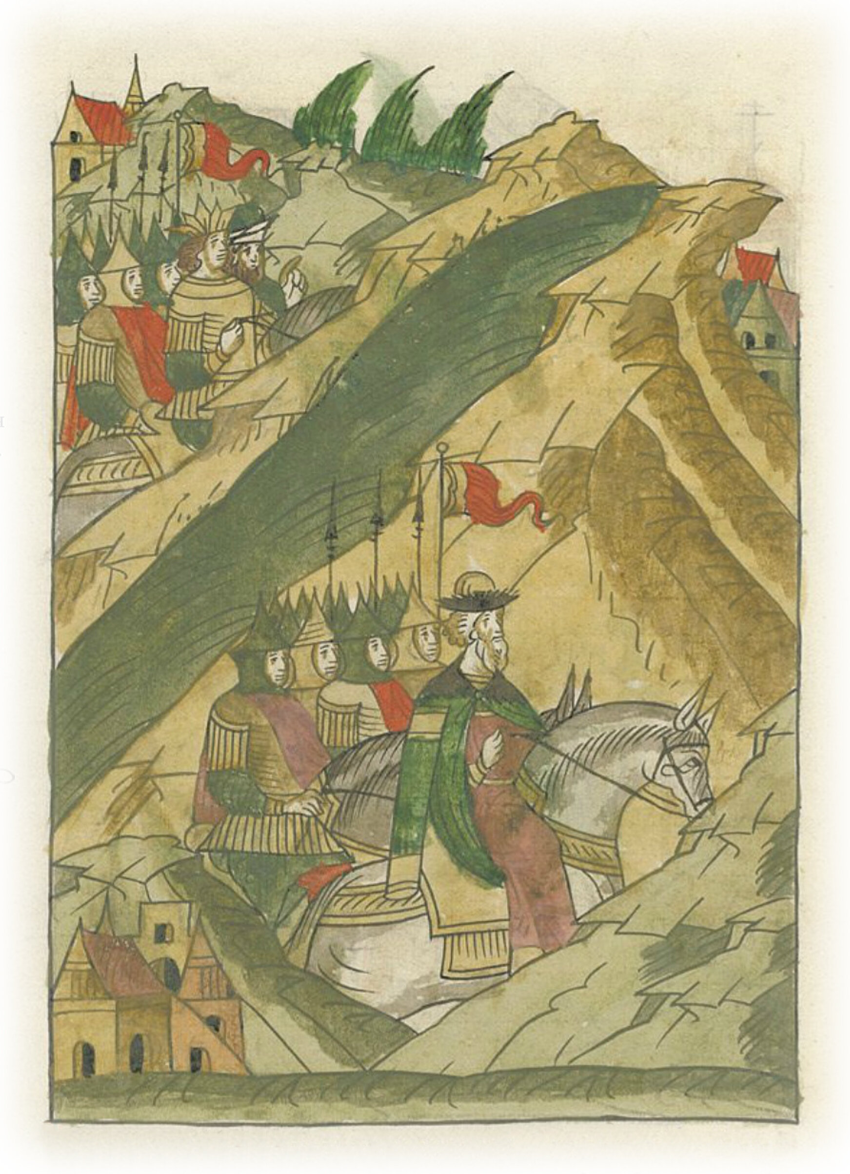Воеводы царя Ивана Васильевича, разделившись, идут в погоню за царем Емгурчеем.