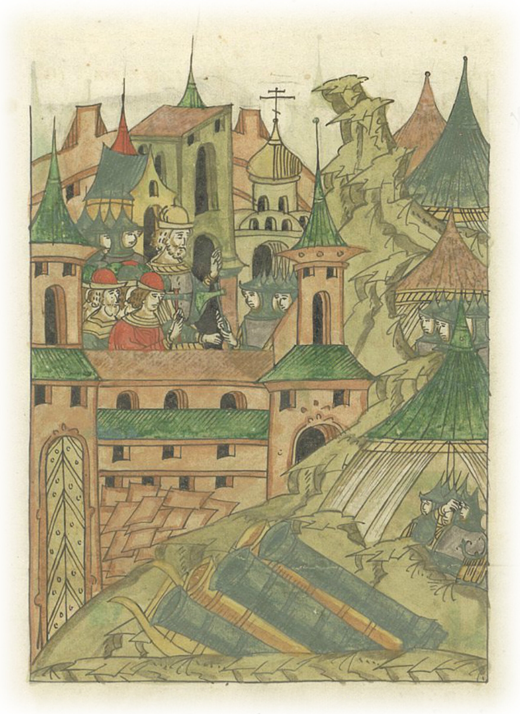 Языки говорят воеводам царя Ивана Васильевича, что магистр окопался большим рвом вокруг города Рындола, бьет из пушек и пищалей и приступает к Рындолу.