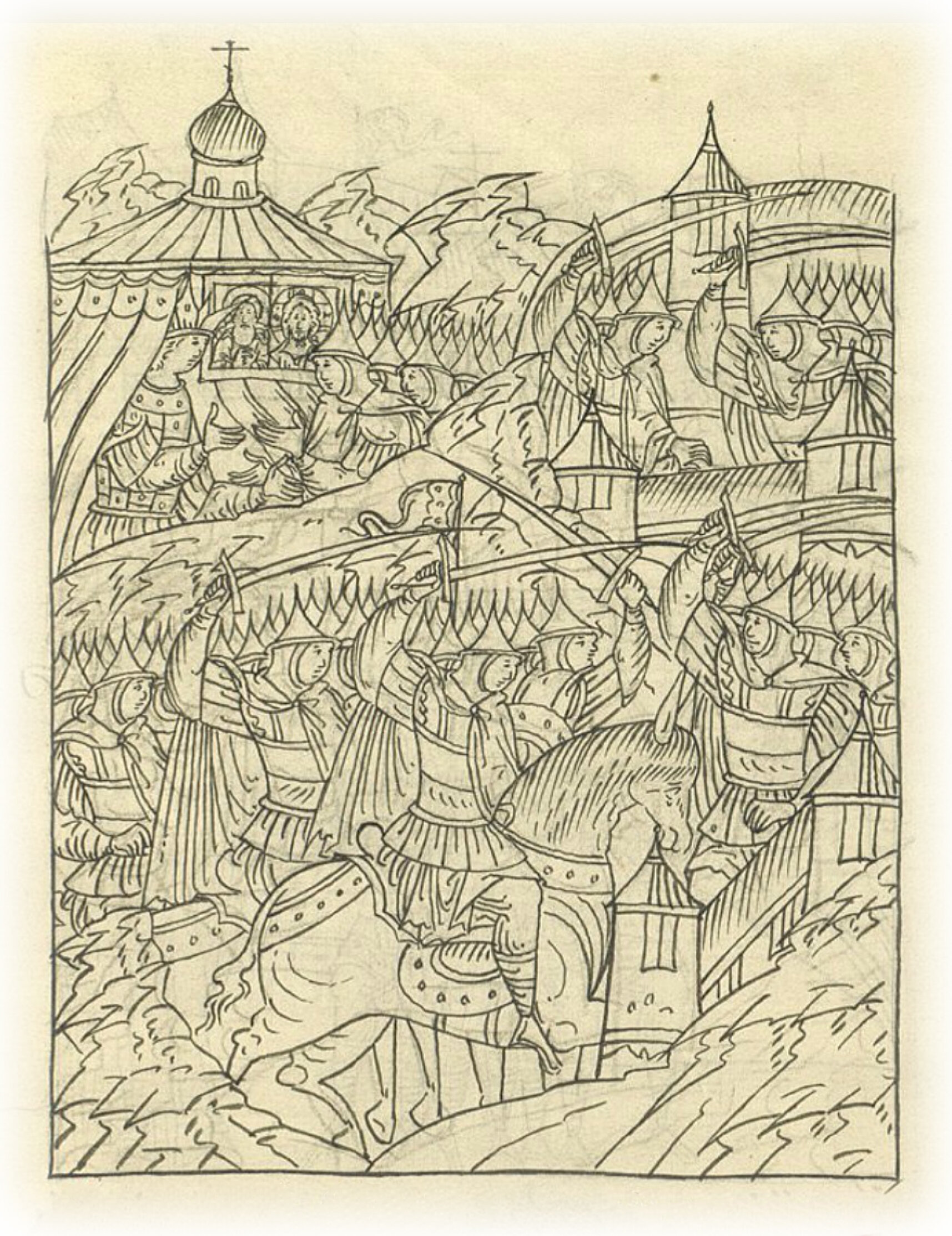 И вскоре вторая весть пришла от города: пришло время царю ехать, чтобы укрепились воины, увидев царя. Царь же, вздохнув из глубины сердца своего и слезы многие проливая, сказал: «Не оставь меня, Господи Боже мой, и не отступись от меня, внемли просьбе моей о помощи».