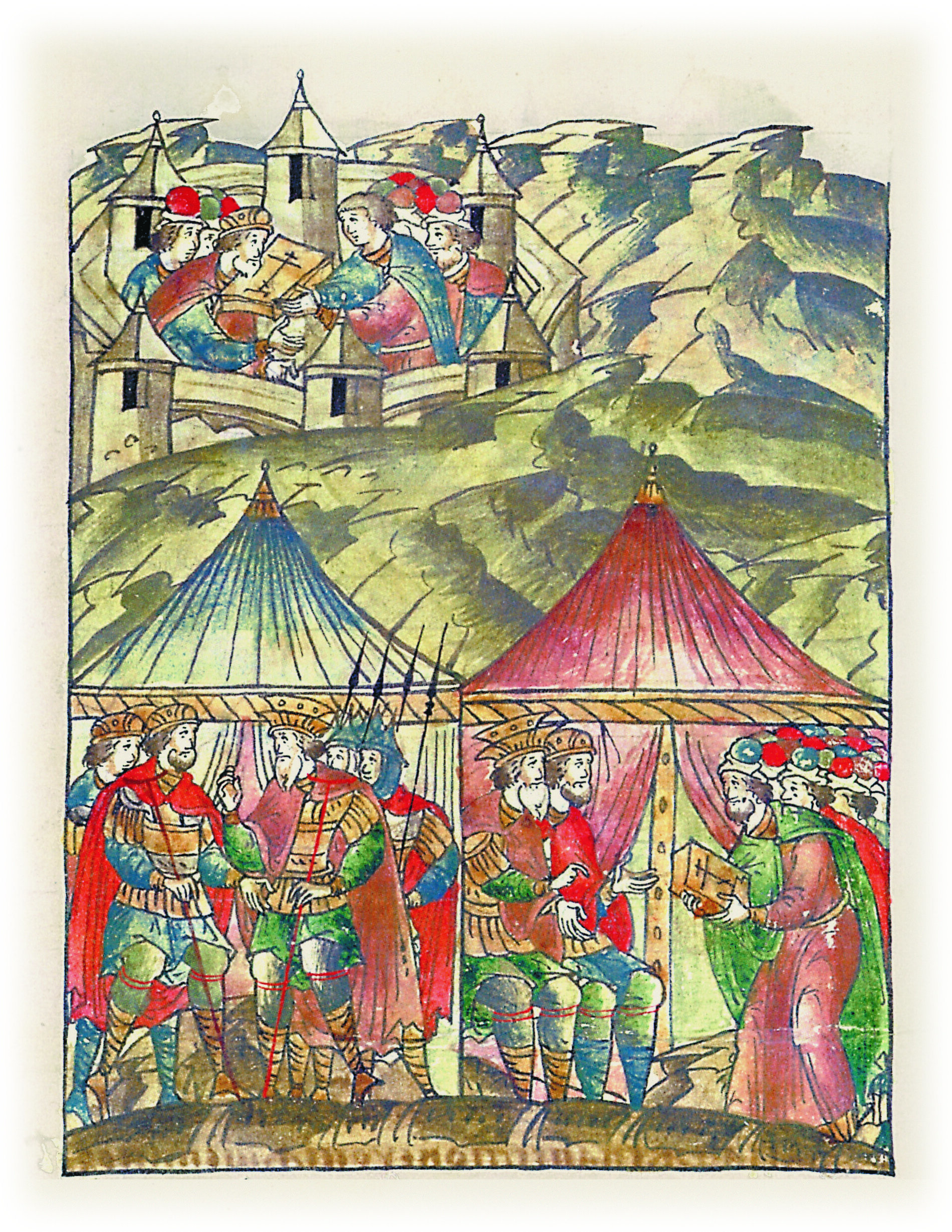 Изяслав же и король, и Владимир, брат Изяслава, и сын его Мстислав пошли все в шатер короля и начали слать мужей своих к Владимиру с крестом; он же целовал крест на всем на том, и так помирились.