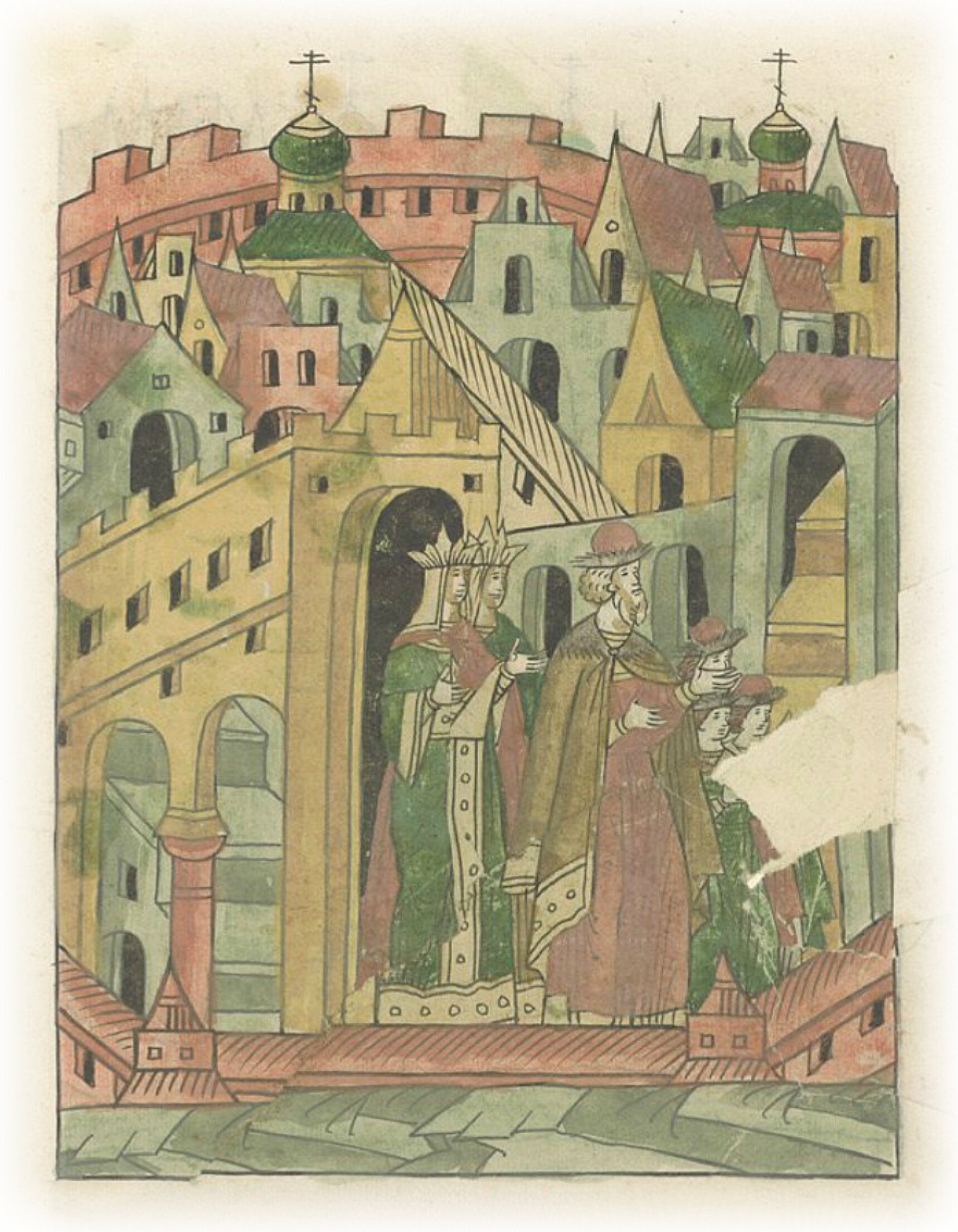 О переходе великого князя из своего двора. В ту же весну (месяца) апреля в 5 день перешел великий князь из своего старого двора в новый двор князя Ивана Юрьевича вместе с великой княгиней Софьей, с детьми, и со снохой великой княгиней Еленой, и с внуком князем Дмитрием;