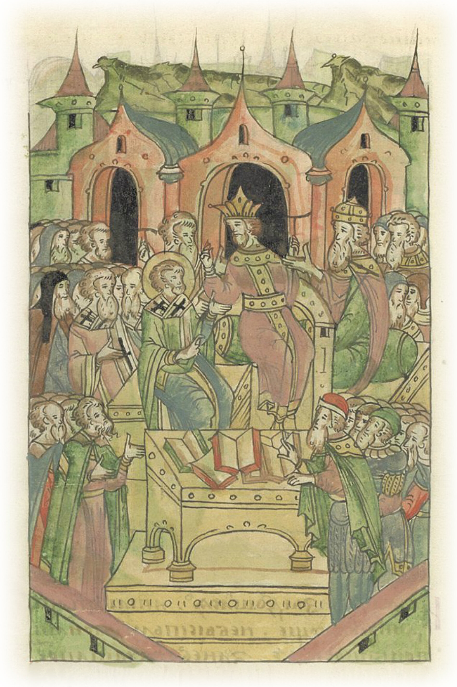 Когда же наступил праздник великого Иоанна Богослова, то начали заседать четвертый раз согласно установленному прежде уставу, начали говорить фрязи; и множество книг принесли; и тогда начались между ними споры, но не пришли они к согласию.