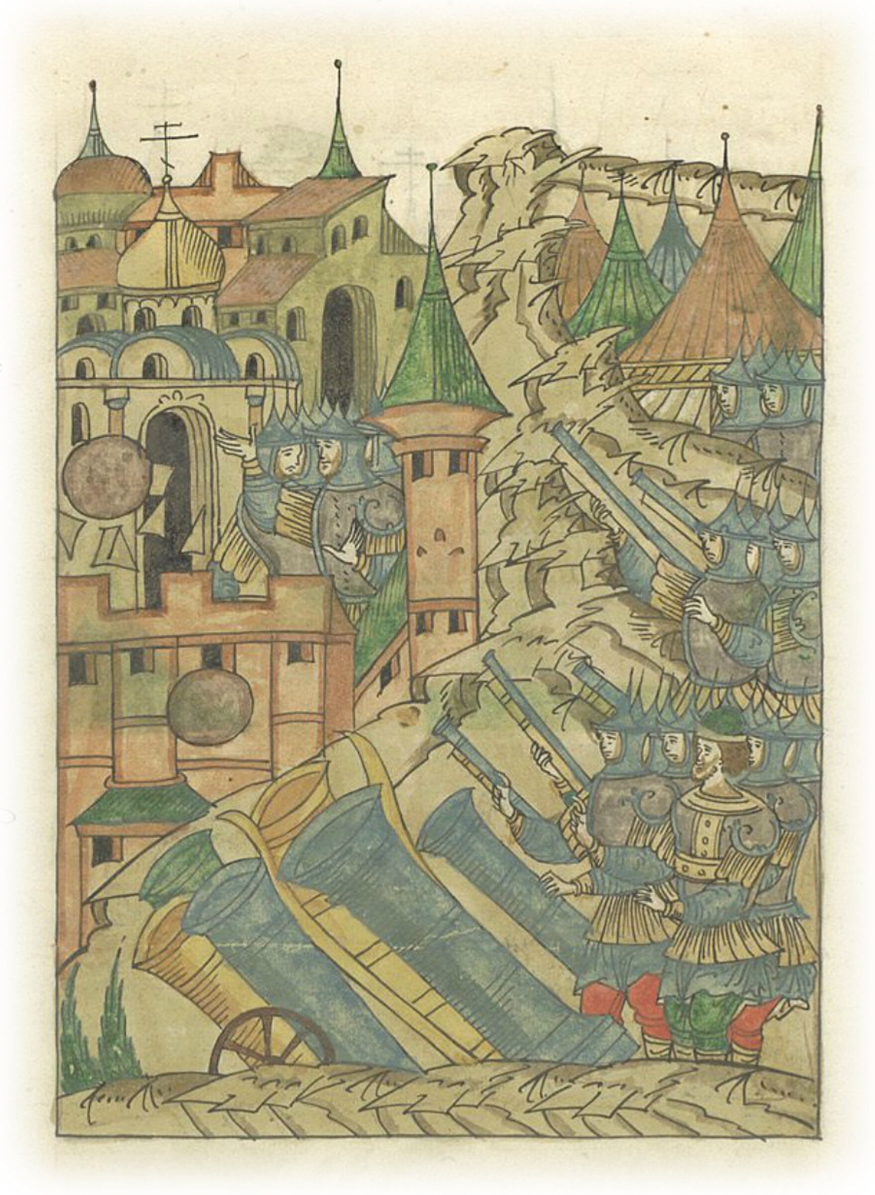Наутро снова начали бить в то же место из многих пушек и пищалей; и когда утрудили* в стену, стреляя из большой пушки, надеясь уже разрушить стену, и Божьим заступлением пошло ядро выше стены, только семь зубцов захватило, и ударило ядро по церковной стене, и распалось в прах. И люди, бывшие там и видевшие это, благодарили Бога. * прицелились.