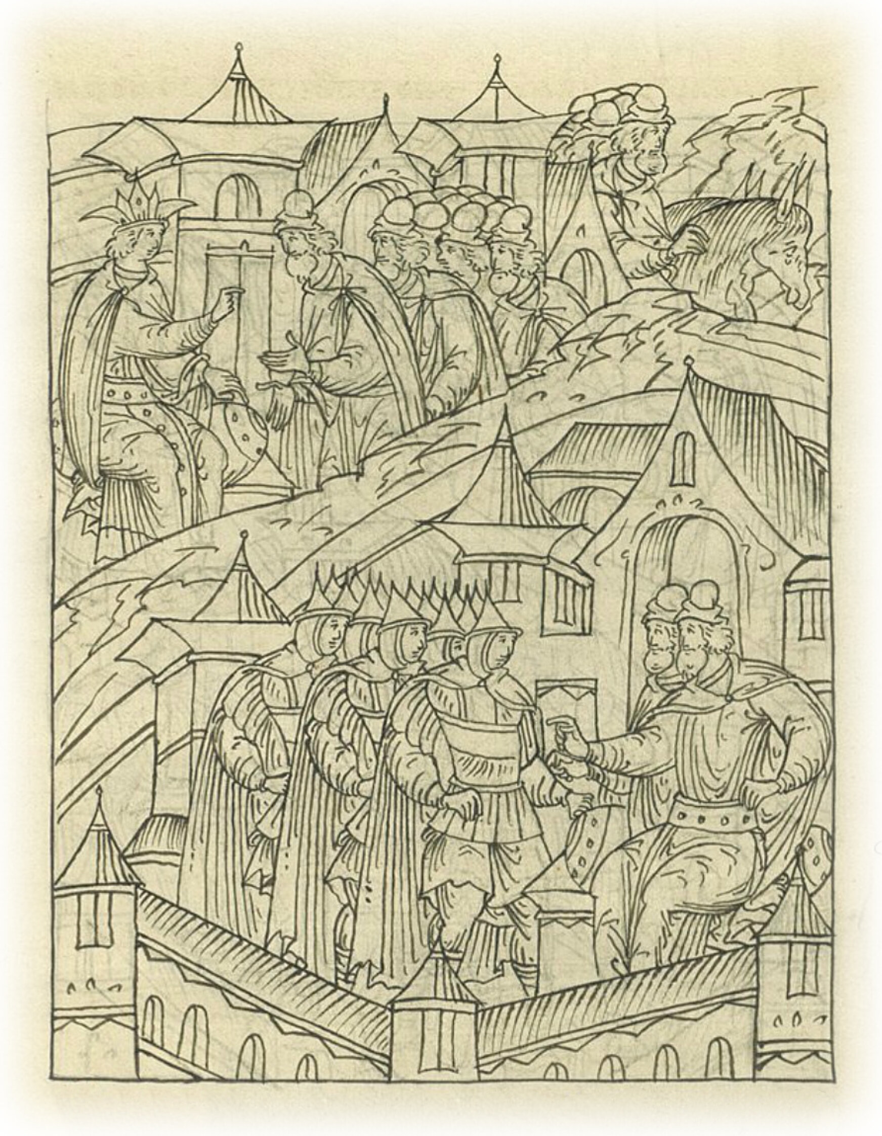 Ругодивские посадники Яким и Захар приезжают в Москву. Воеводы царя Ивана Васильевича Алексей Адашев и Иван Михайлов сообщают им, что государь пожалует их, если сдадут его воеводам помимо Ругодива Вышгород.