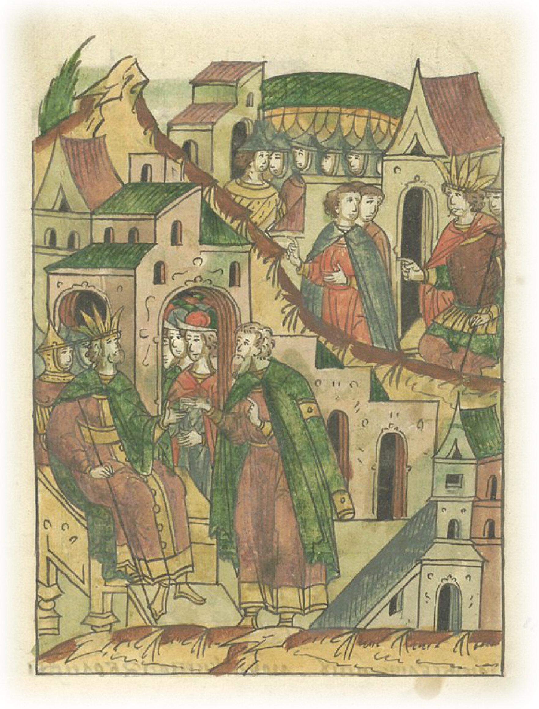 Ругодивские посадники Яким и Захар приезжают в Москву. Воеводы царя Ивана Васильевича Алексей Адашев и Иван Михайлов сообщают им, что государь пожалует их, если сдадут его воеводам помимо Ругодива Вышгород.