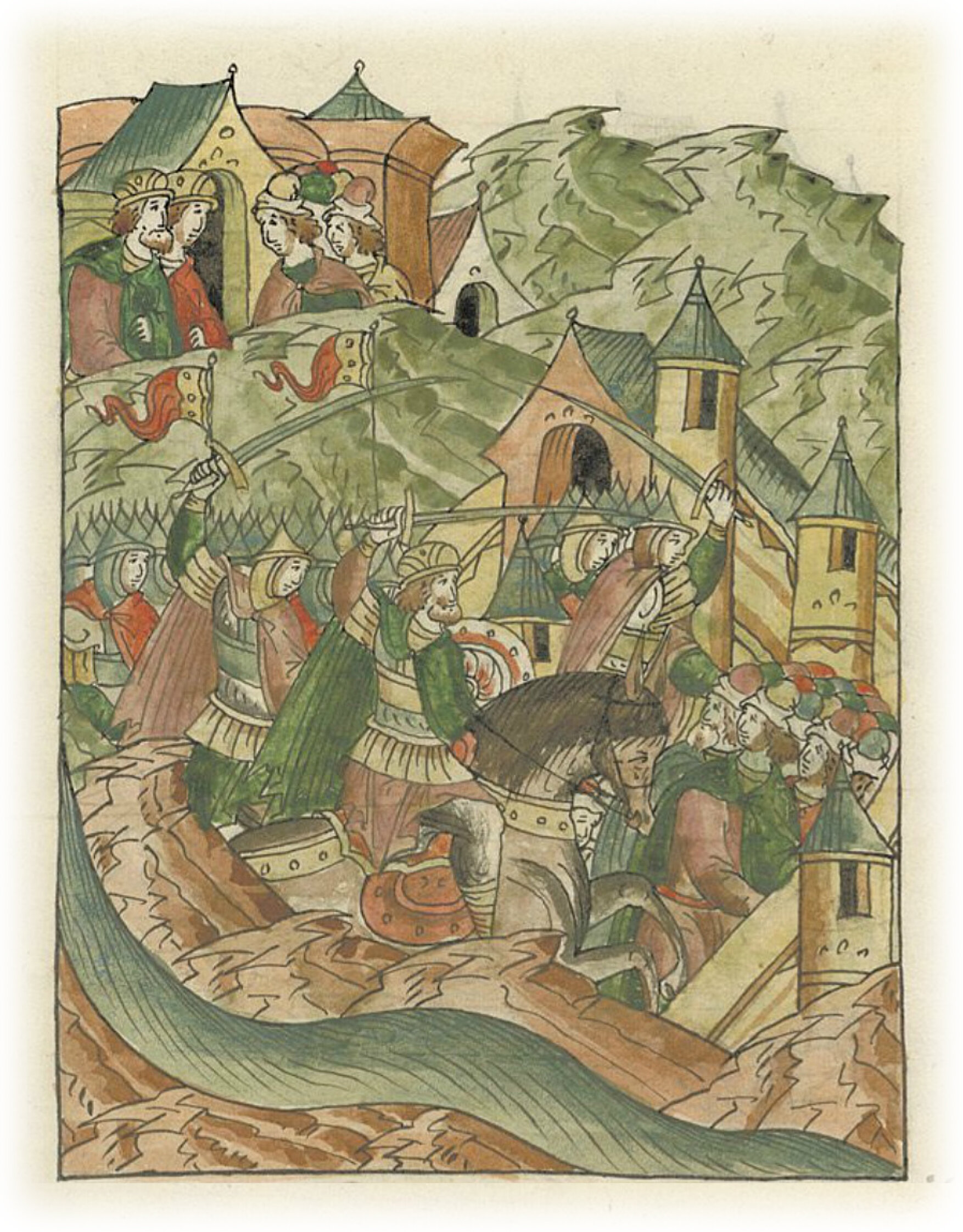 Языки говорят воеводам царя Ивана Васильевича, что магистр окопался большим рвом вокруг города Рындола, бьет из пушек и пищалей и приступает к Рындолу.