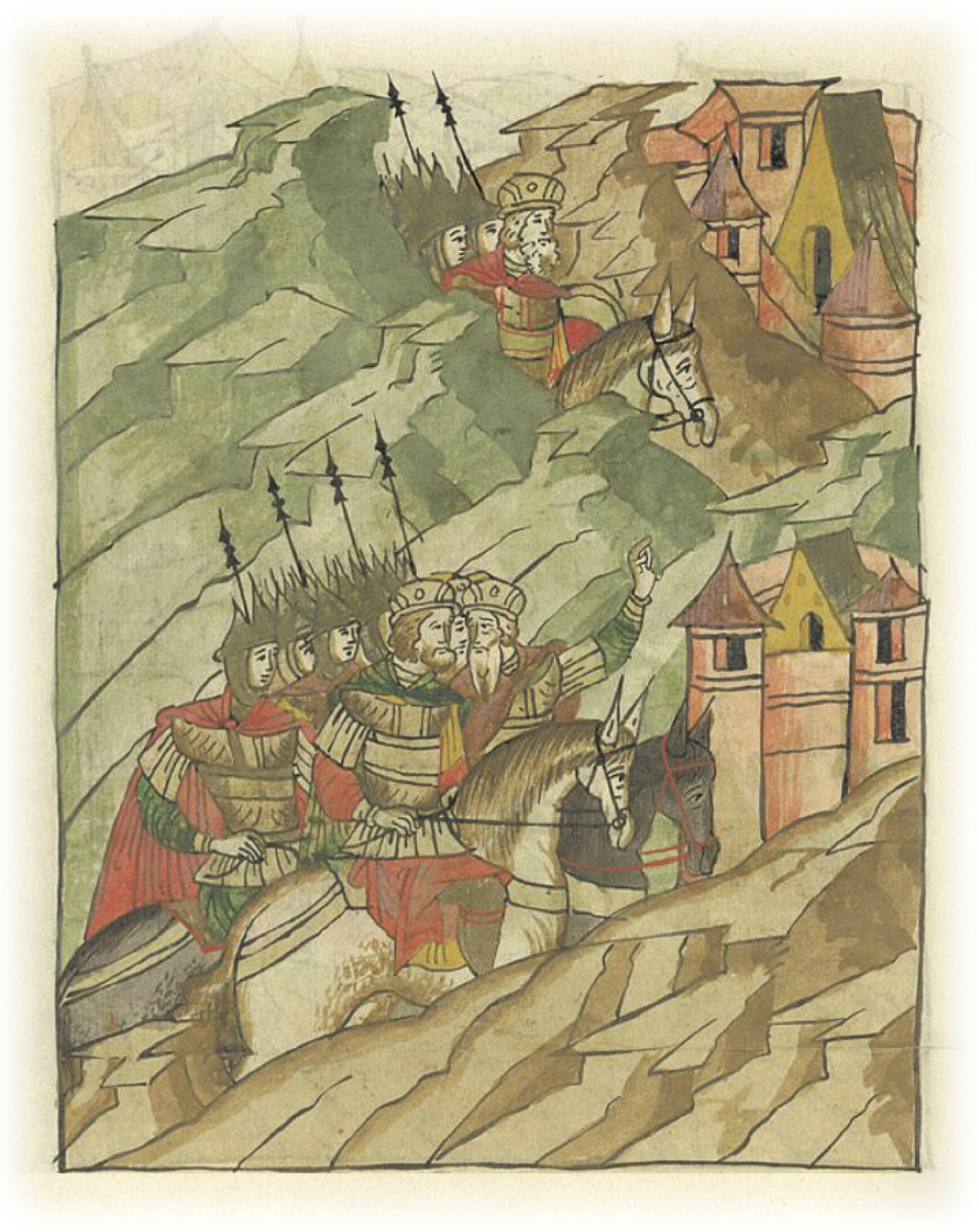 Воеводы царя Ивана Васильевича, разделившись, идут в погоню за царем Емгурчеем.