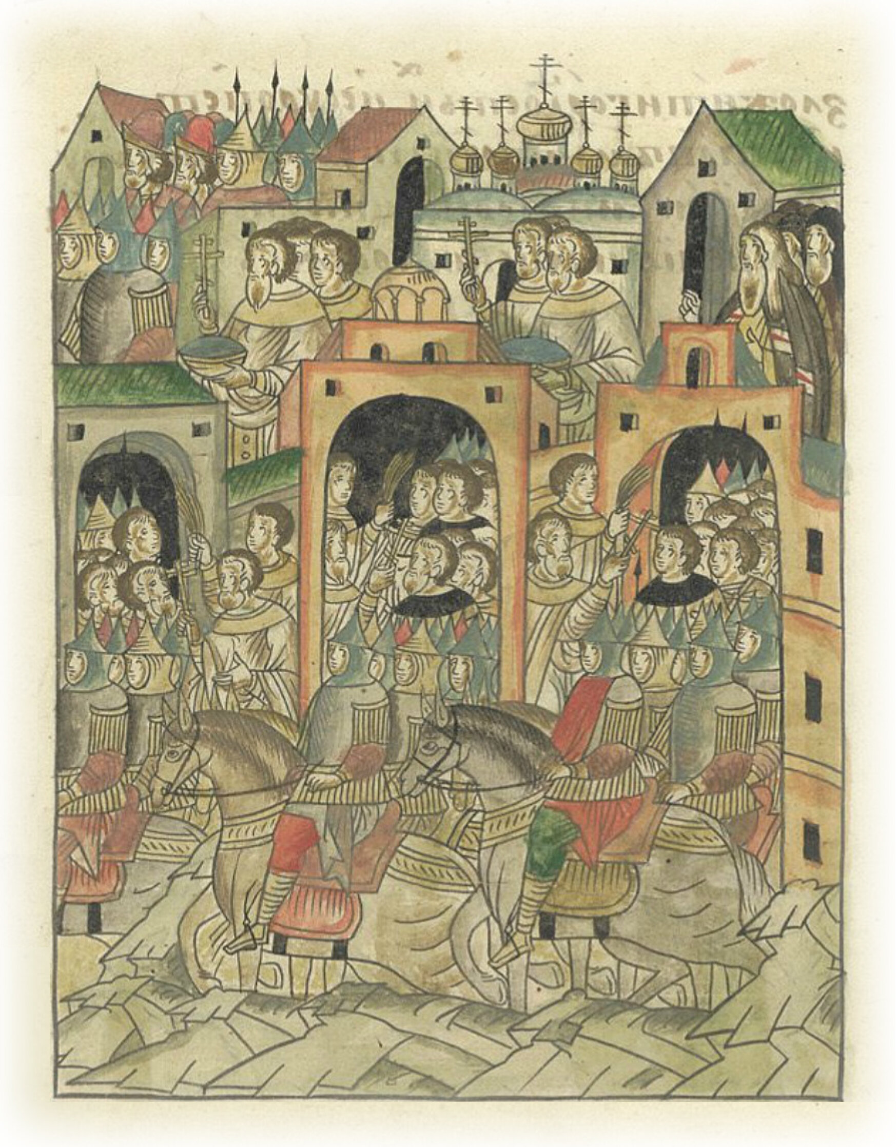 И послал пресвитеров и дьяконов многих с честными крестами и с освященною водою в Никольские, и во Флоровские, и в Константино-Еленинские ворота – благословлять всех, чтобы всякий воин благословился им и освященною водою окропился.