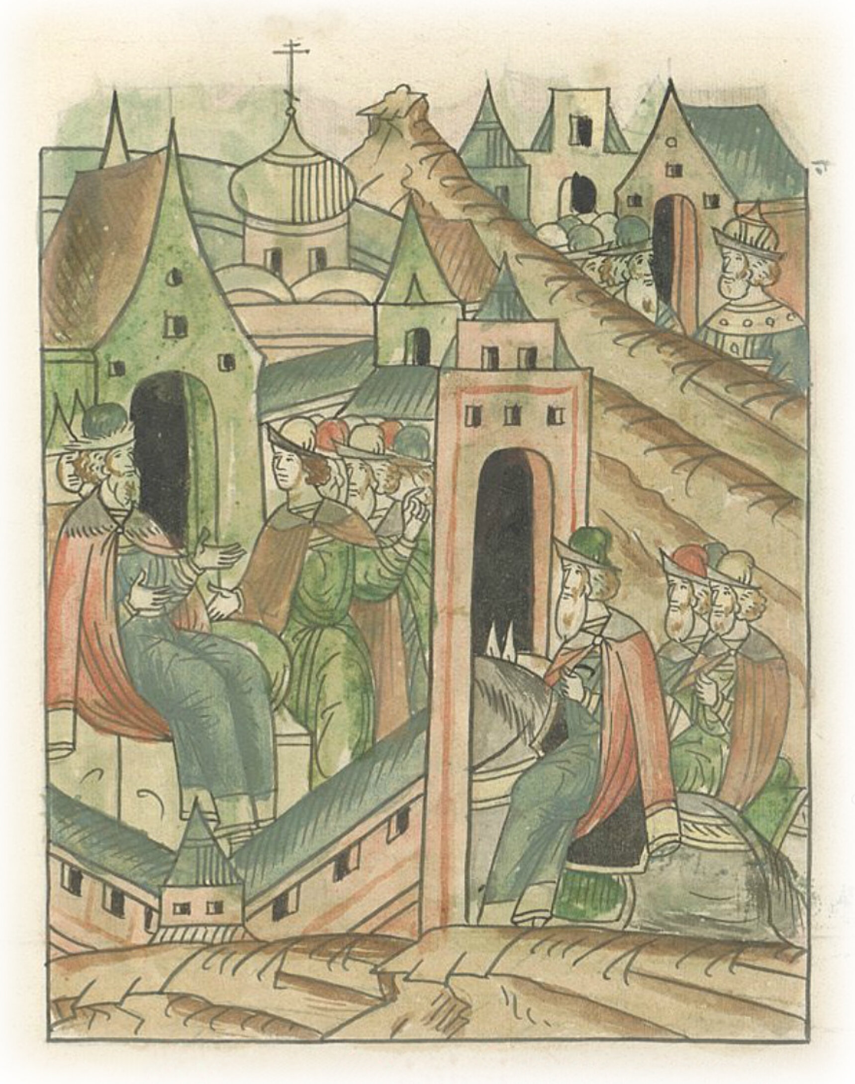 Ругодивские посадники Яким и Захар приезжают в Москву. Воеводы царя Ивана Васильевича Алексей Адашев и Иван Михайлов сообщают им, что государь пожалует их, если сдадут его воеводам помимо Ругодива Вышгород.