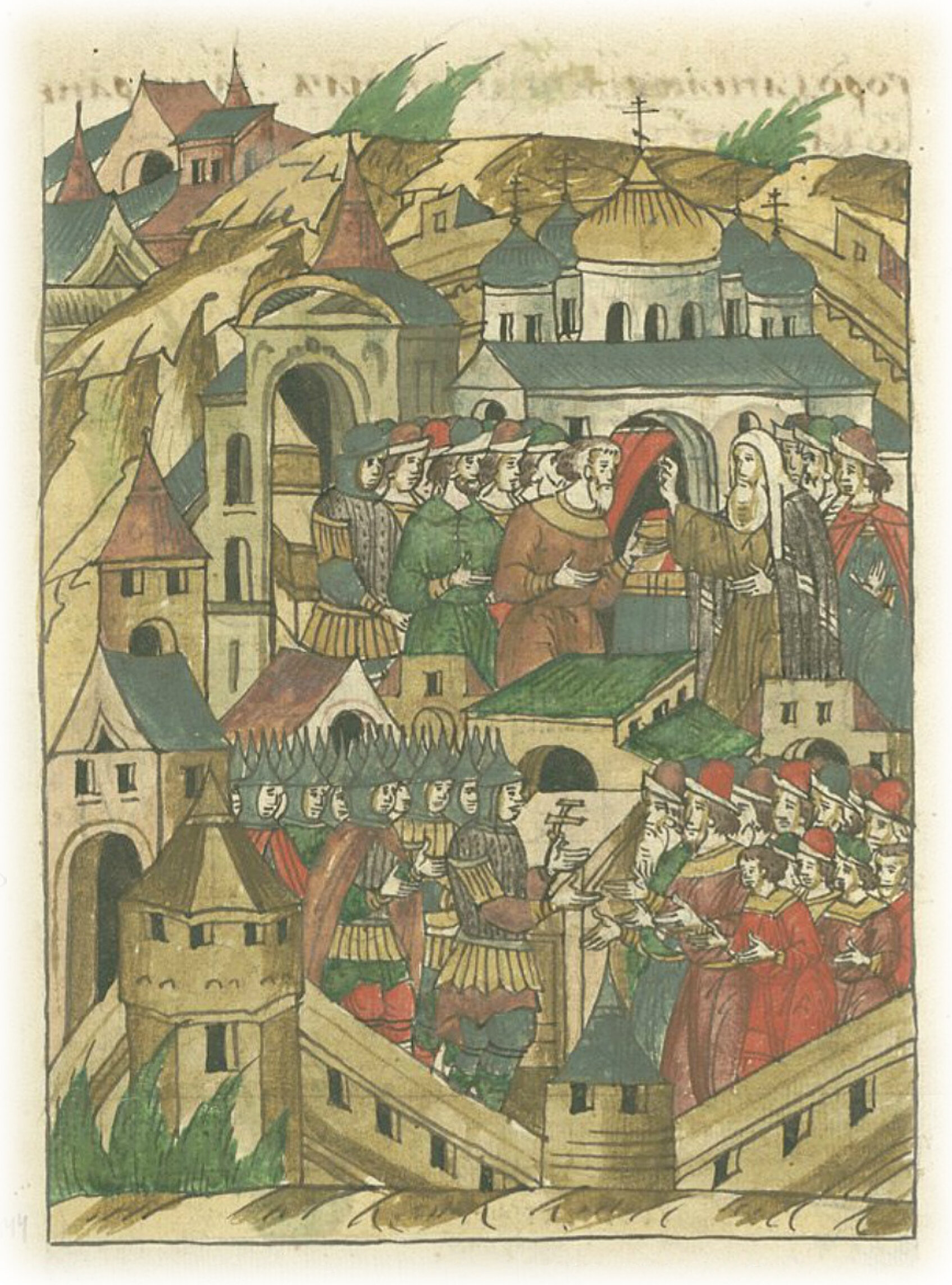 В том же году собрались новгородцы и пришли к своему владыке Иоанну, говоря: «Не можем мы, господин, больше терпеть насилия от великого князя Василия Дмитриевича, того, что отнял он у святой Софии и у Великого Новгорода принадлежащие им пригороды и волости, наши отчины и дедины, как было заведено изначально. И мы, господин, хотим вернуть святой Софии ее пригороды и волости, отчину свою и дедину». И все целовали крест на том, чтобы вернуть святой Софии и Великому Новгороду пригороды и волости, и били челом владыке посадник Тимофей Юрьевич, Юрий Дмитриевич, Василий Борисович, бояре и боярские дети, горожане и купцы, и все новгородские воины, говоря: «Благослови, владыка, нас вернуть святой Софии пригороды и волости, и мы или вернем отчину святой Софии и Великому Новгороду, или сложим свои головы за святую Софию и Великий Новгород». И владыка Иоанн благословил детей своих новгородских воевод и все воинство. А весь Новгород собрался от мала до велика, от убогих и нищих и решил: «Пойдем мы, господин, чтобы вернуть святой Софии пригороды и волости, свою отчину».