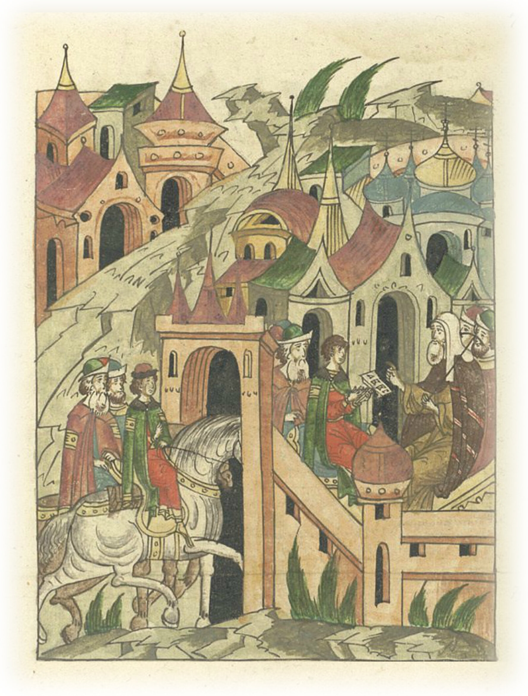 Княжич Михаил Александрович Тверской приходит к Новгородскому владыке Василию учиться грамоте.