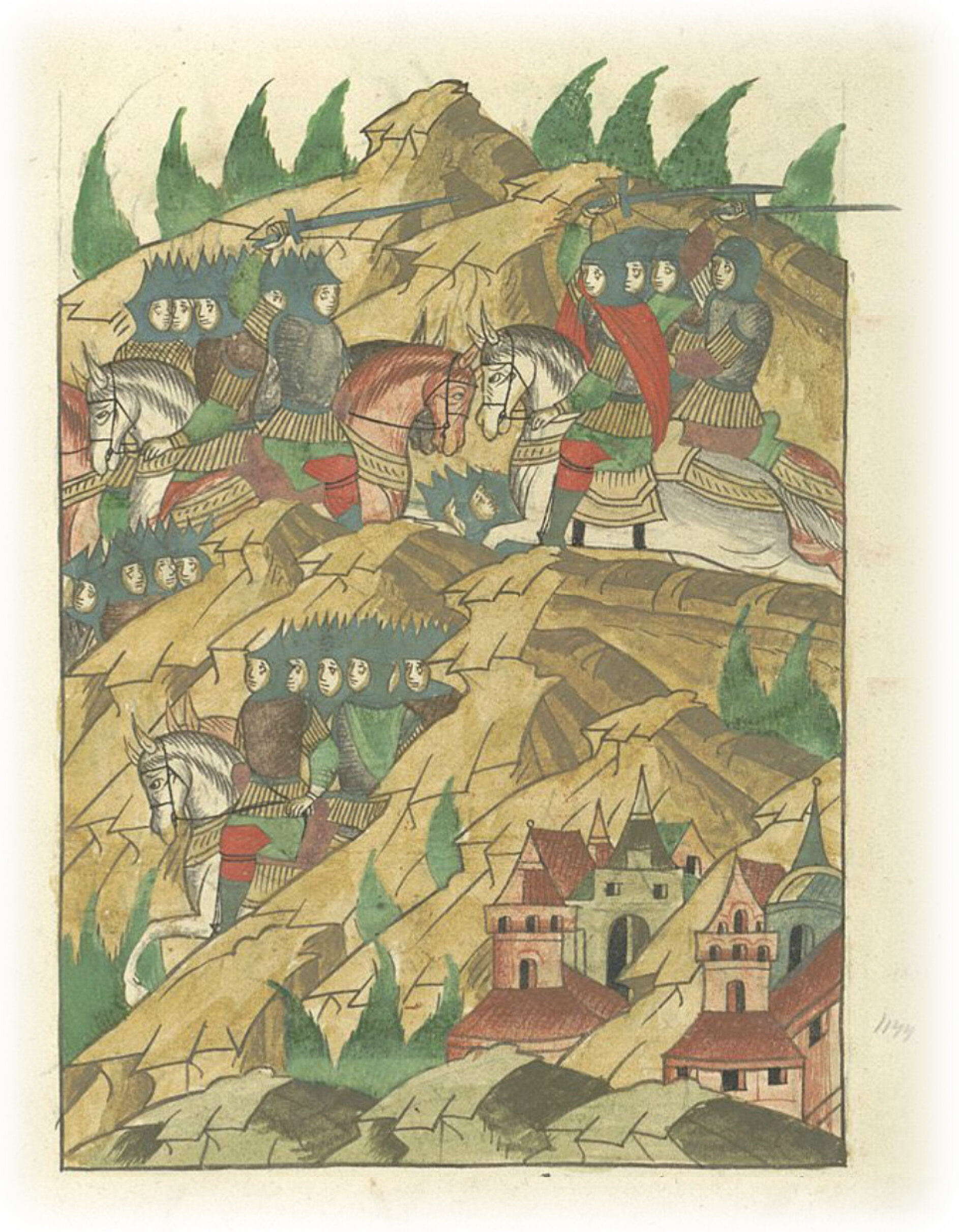 Языки говорят воеводам царя Ивана Васильевича, что магистр окопался большим рвом вокруг города Рындола, бьет из пушек и пищалей и приступает к Рындолу.