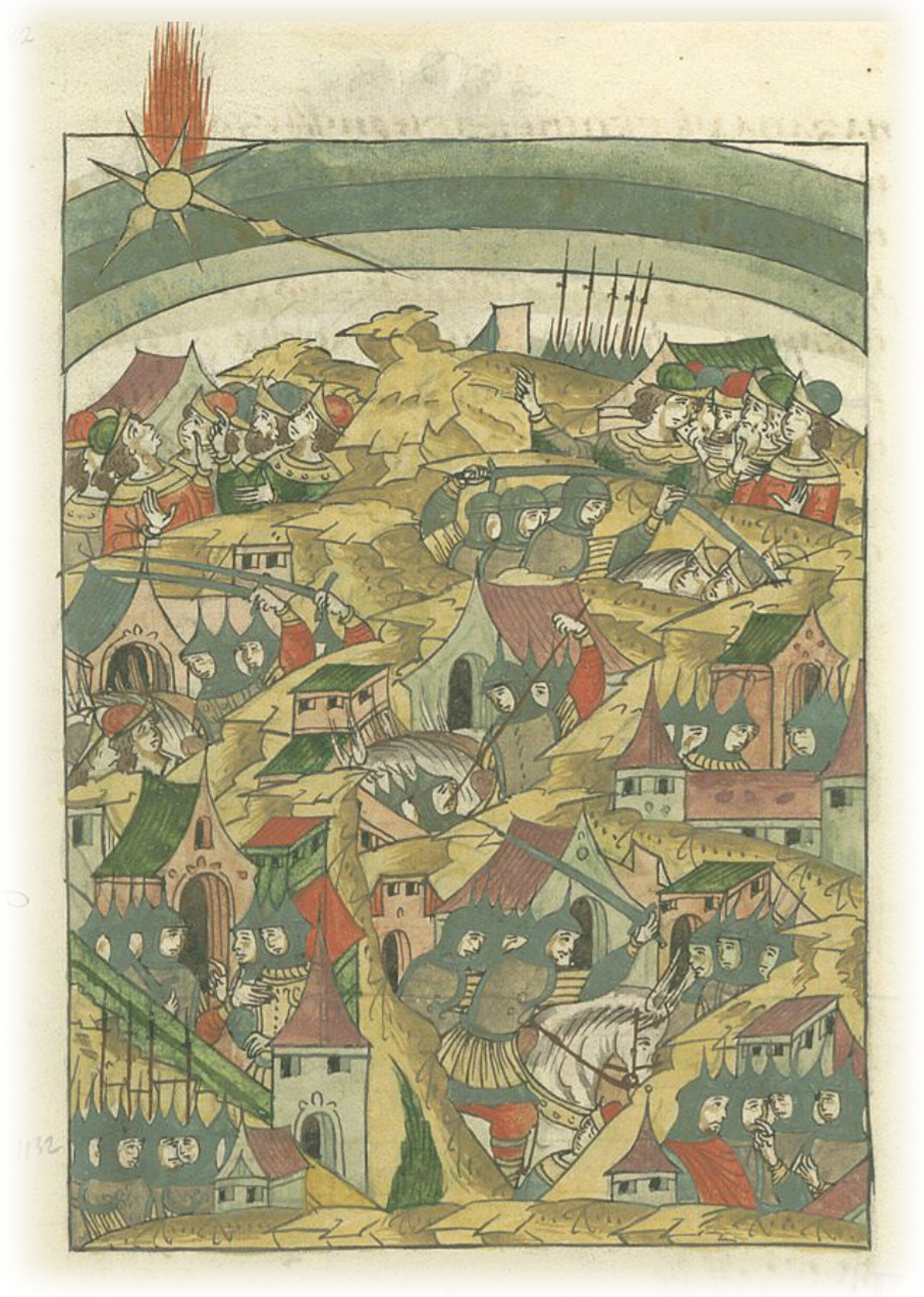 Знамение. В ту же зиму в Великий Пост месяца марта явилось знамение на западе во время заката: огромная звезда, на верху которой сиял луч, обходила землю, видели ее в течение двадцати дней восходящей на востоке и сияющей вечером на западе. Это знамение означало, что восстанут народы друг против друга: турки, ляхи, угры, немцы, литва, чехи, орда, греки, русы, и многие другие страны и земли будут охвачены смутой и будут воевать друг с другом, кроме того, начались моры.