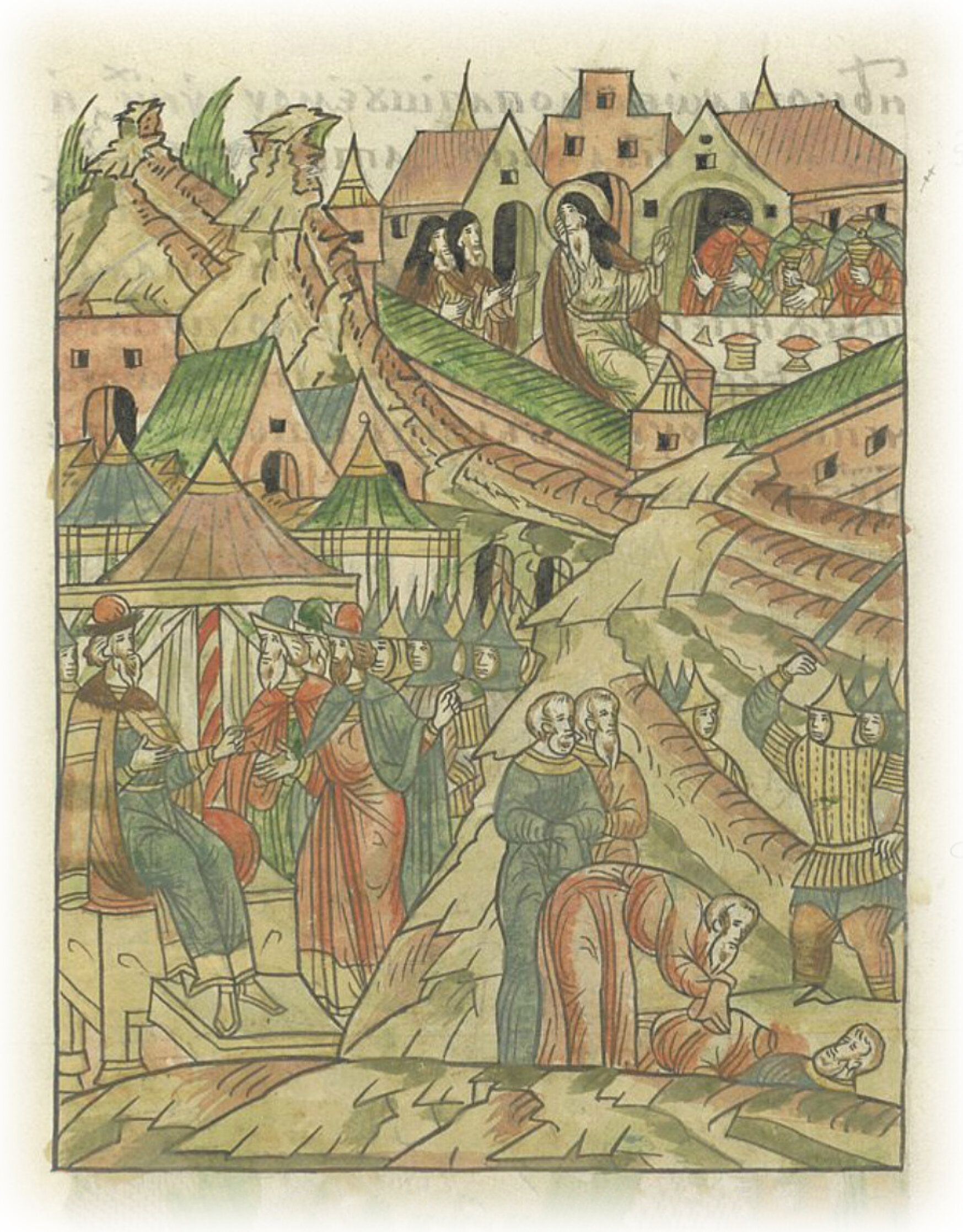 И там посадников новгородских повелел казнить отсечением головы за их измену и за отступление: Дмитрия Исакова Борецкого, да Василия Селезнева Губу, да Еремея Сухощока, да Киприана Арзубьева, о которых еще прежде предсказывал преподобный Зосима, основатель Соловецкого монастыря, о чем в житии его пишется. Некогда обедал он у них и увидел их сидящими в трапезе во время обеда, а голов на плечах их не было. И, видя это, преподобный заплакал, перестал есть и учеников своих известил, что за гордыню их будут отсечены головы их. Что и сбылось.