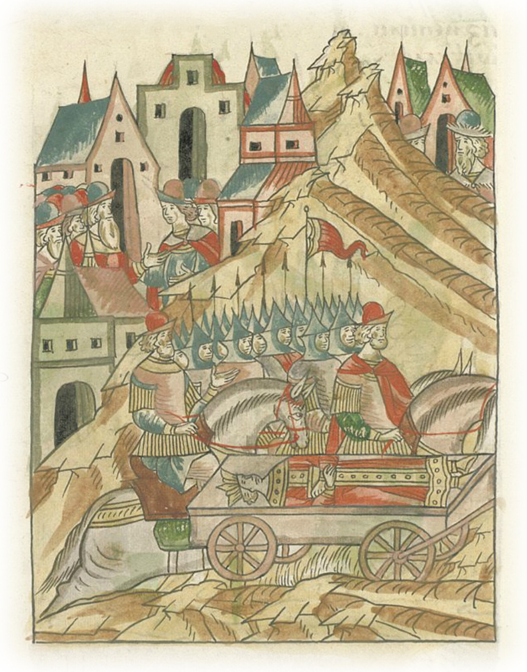 Языки говорят воеводам царя Ивана Васильевича, что магистр окопался большим рвом вокруг города Рындола, бьет из пушек и пищалей и приступает к Рындолу.
