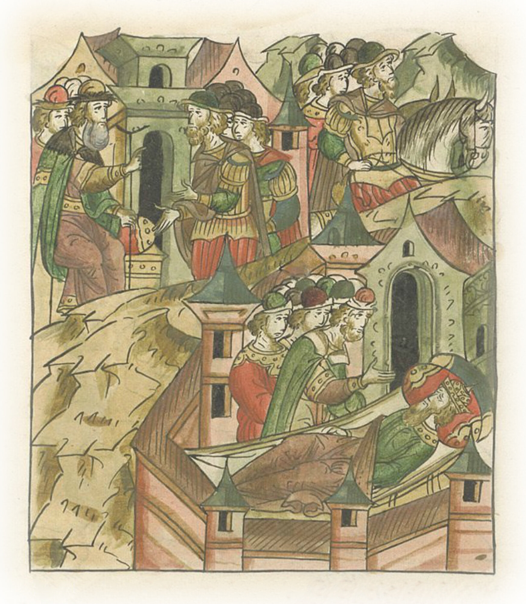 И великий князь, почтив их, отпустил. И в 7027 (1519) году в январе Максимиан цесарь скончался.