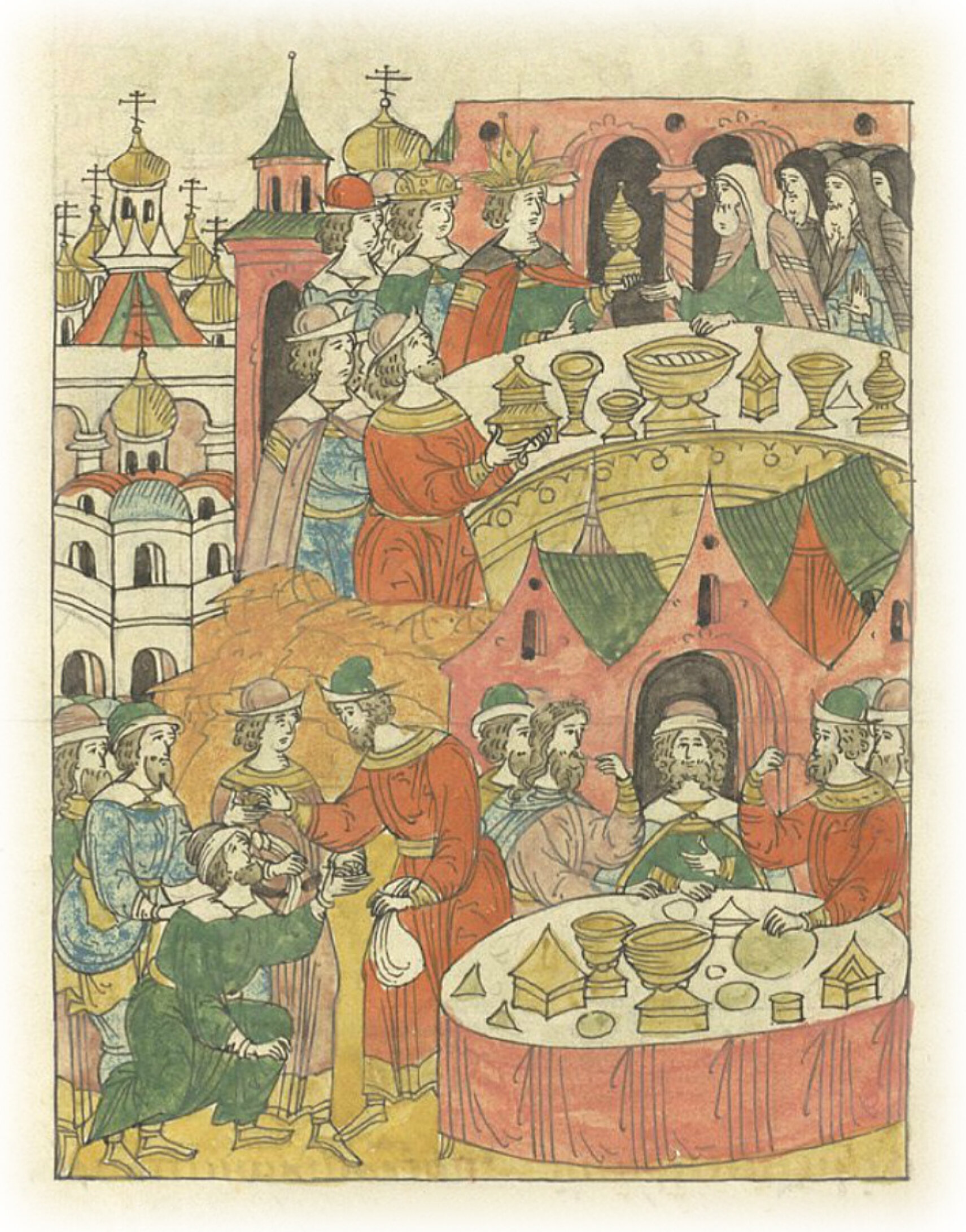 И праздновал государь день тот честно и радостно, и с отцом своим Макарием митрополитом, и с епископами, и с архимандритами, и игуменами, и со всем собором Русской митрополии; и нищих множество кормил и милостыню достаточную им повелел давать.