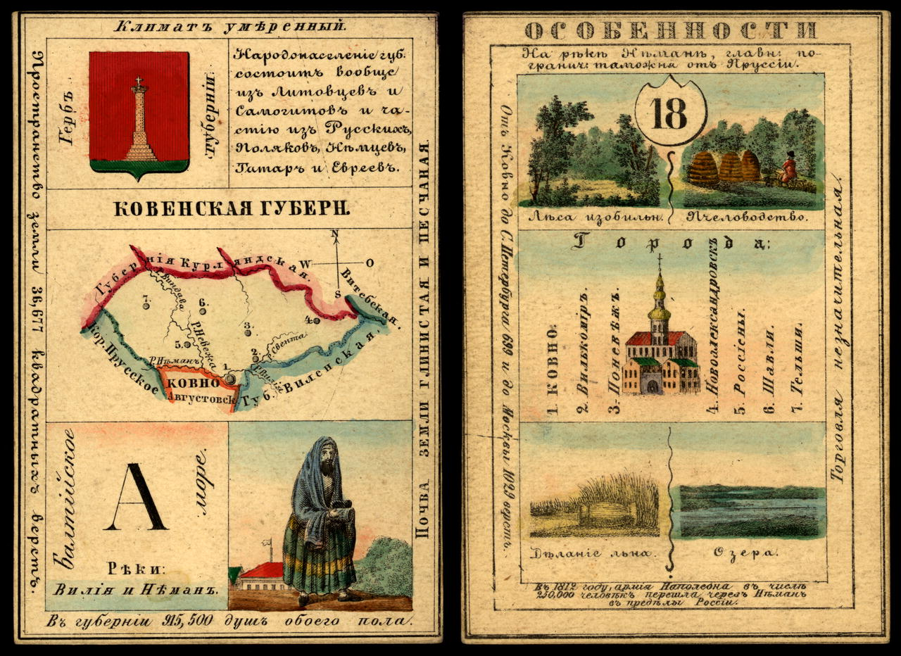 Ковенская губерния в западн. части Европ. России, по границе с Пруссией, часть прежней Литвы. Площадь —35316 кв. в. Поверхность ровная, местами всхолмленная (до 823 фт.); большей частью почва дерновая суглинистая и супесчаная, удобная для хлебопашества; много болот. Известняк, гипс, песчаники, горшечная глина, железняк. В Поневежском, Ново-Александровск. и Ковенск. уу. серные и железистые воды. Леса занимают 1/6 площади губ.; породы хвойные (60%) и лиственные. Фауна богата. Климат умеренный, для г. Ковно средн. темп. +6,2°.— Реки К. г. принадлежат Балтийскому бассейну; Неман (в губ. 130 в.) и Виндава. Озер до 600, все небольшие; развито рыболовство.— Население живет в 9 городах, 236 местечках и 24396 сел. и др. населенн. пунктах. Жителей 1684 т., из них 147 т. в городах.