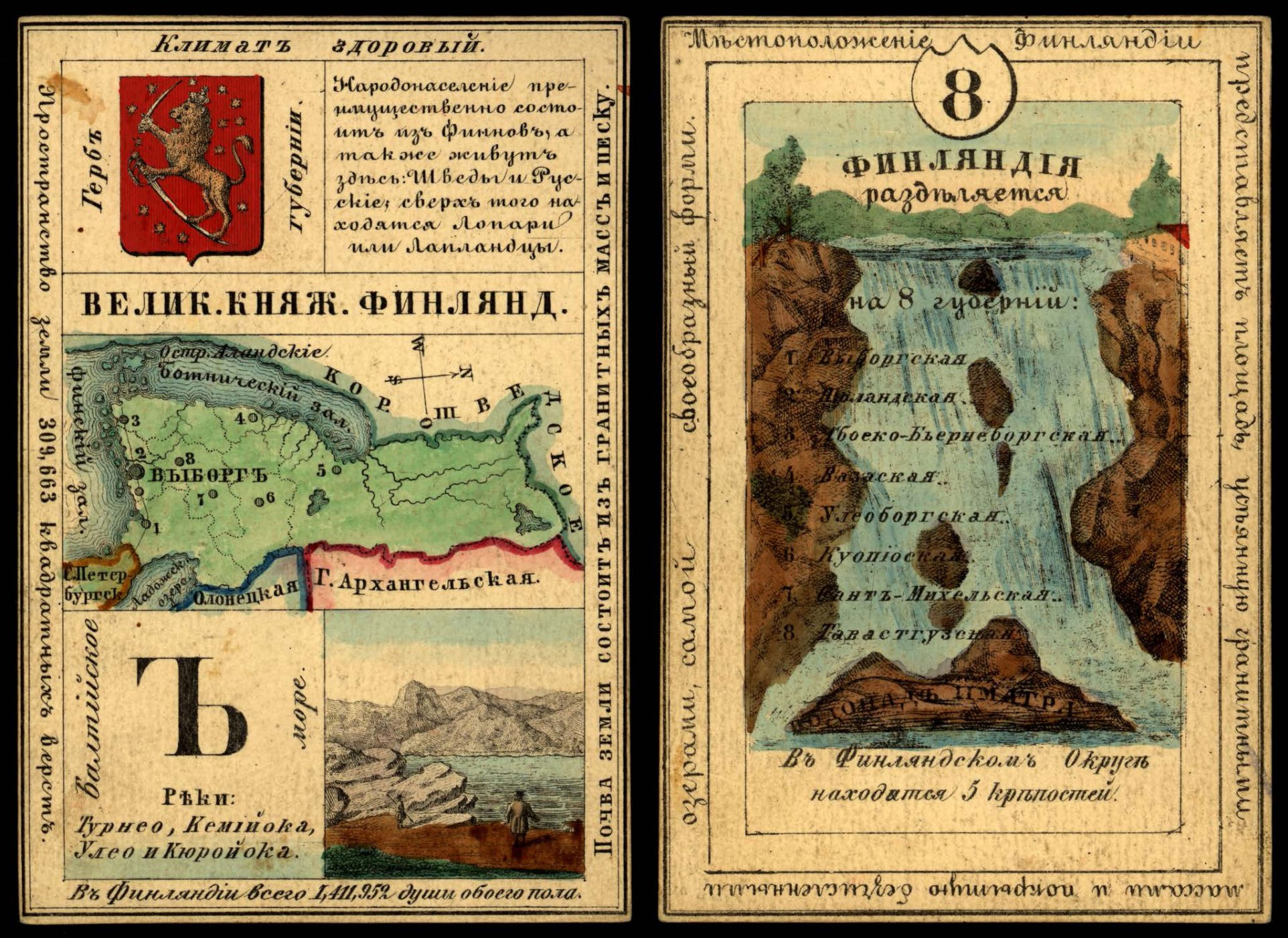Финляндия разделяется на 8 губерний: 1. Выборгская, 2. Ньюландская, 3. Абоеко-Биернеборгская, 4. Вазаская, 5. Улеоборгская, 6. Куопиоская, 7. Сант-Михельская, 8. Тавастгузская.