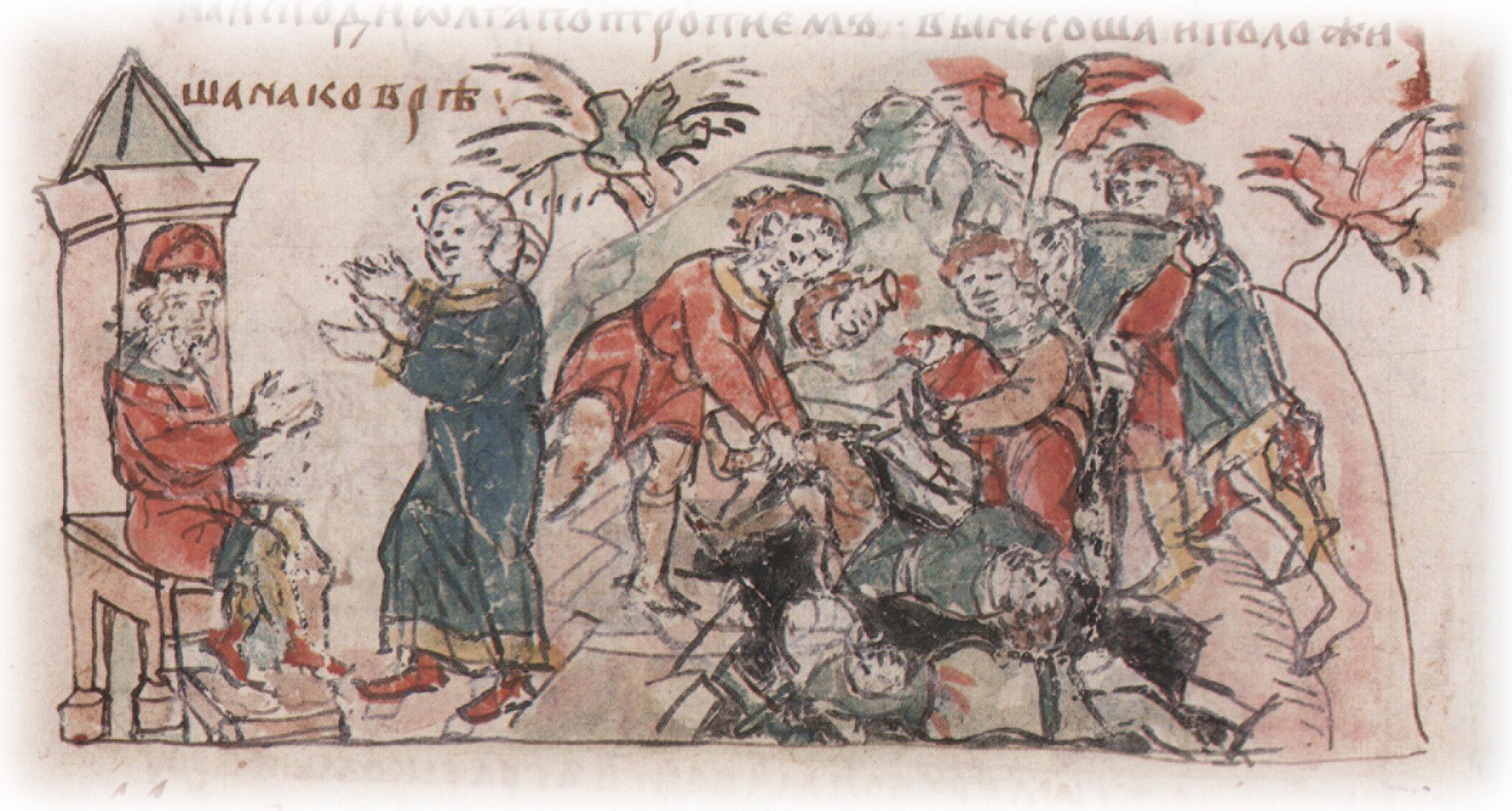 Повеление Ярополка Свыятославича о поиске трупа убитого брата Олега Святославича; положение трупа Олега на ковер.