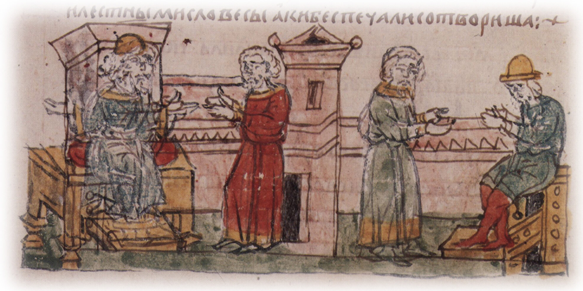 Рисунок "мастера Б" — перо. Правлен (фигуры, лица, шапка, столы, архитектура) "мастера В" — кисть.