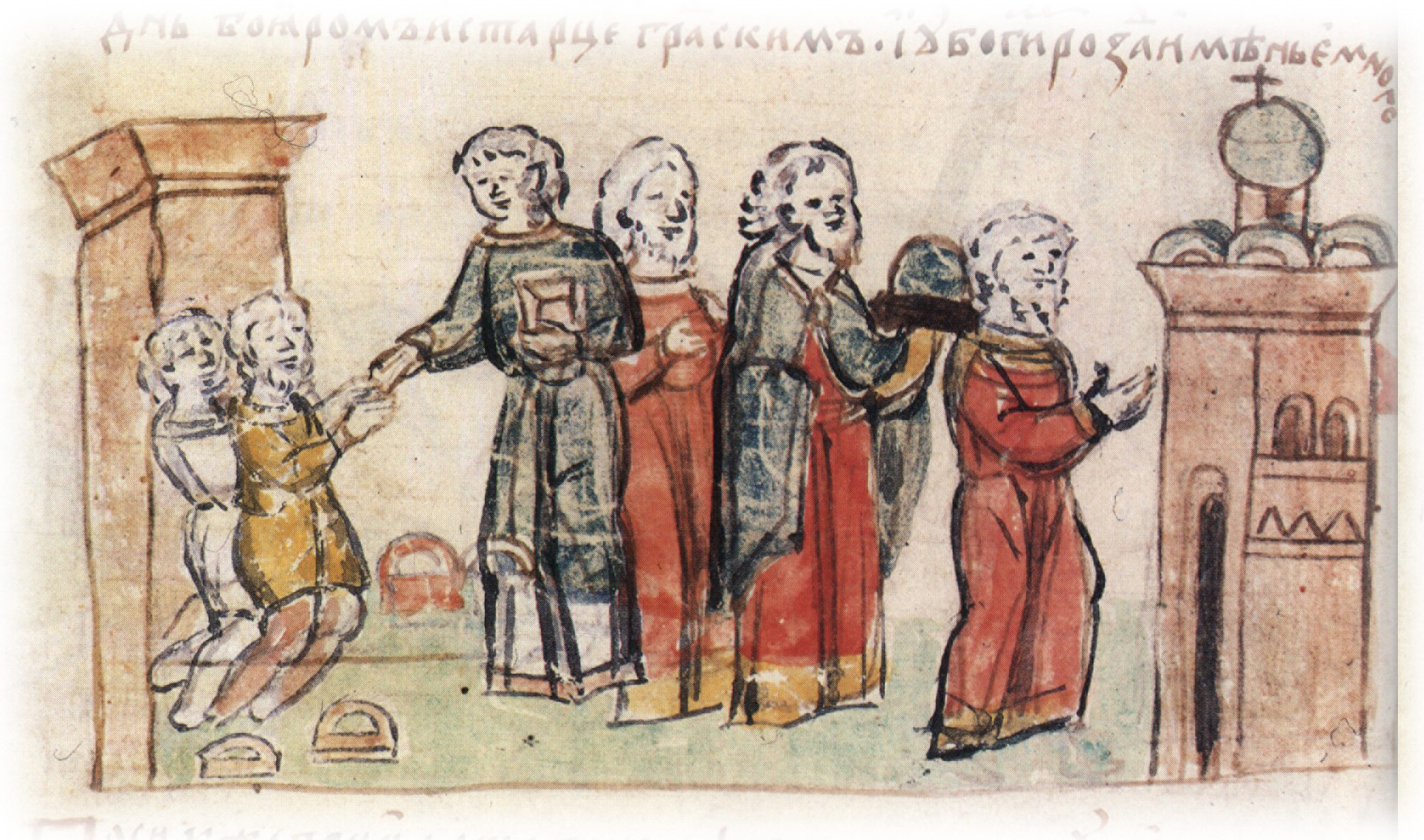"В лето 6504. ...И помолившюся ему, рек сице: «Се даю церкви сей Святей Богородици от имениа моего и от градов моих 10-ю часть». И положи написав клятву в церкви сей... И вдасть десятину Настасу Корсунянину. И сотвори же празник велик в той день бояром и старцем градским, и убогим розда имение много".