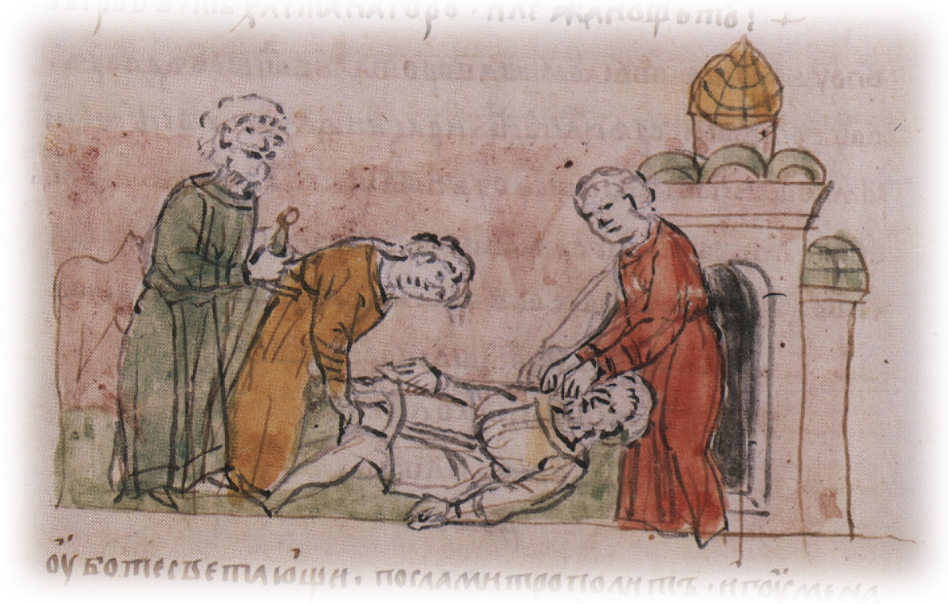 Перенесение тела Игоря Ольговича с торга в Михайловскую церковь по указанию тысяцкого Лазаря.