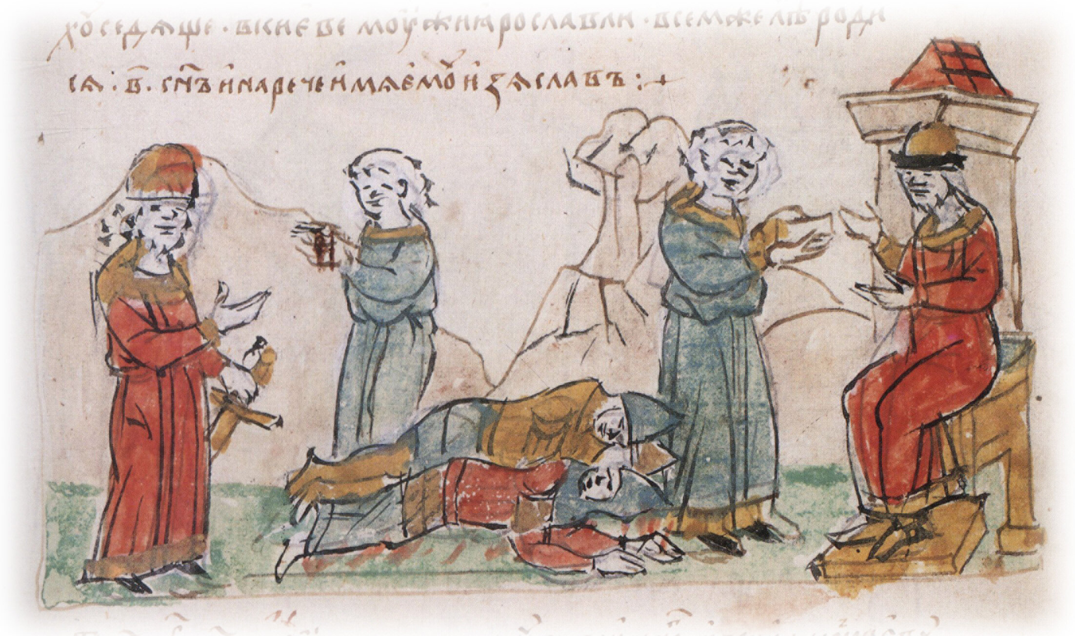 Тайное погребение Владимира Святославича, умершего в Берестове: спуск его тела на землю на ковре между разобранными клетьми здания; положение тела Владимира в мраморный гроб в церкви Святой Богородицы.