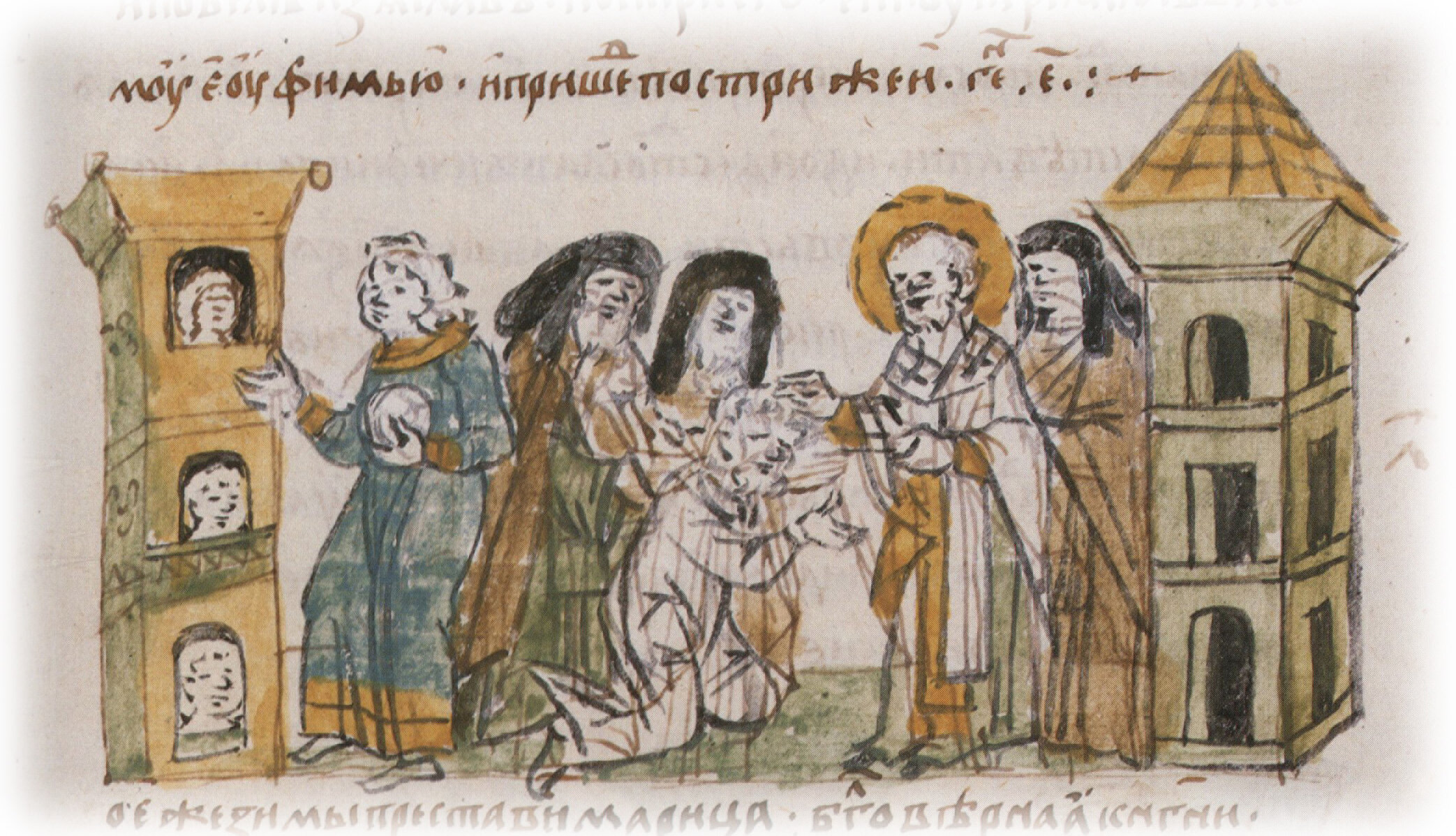 Рисунок "мастера Б" — перо. Правлен (фигуры, лица, клобуки, архитектура) и дополнен (нимб, коленопреклоненная фигура, лица в окнах первого и второго ярусов башни слева, шатер башни справа) "мастера В" — кисть.