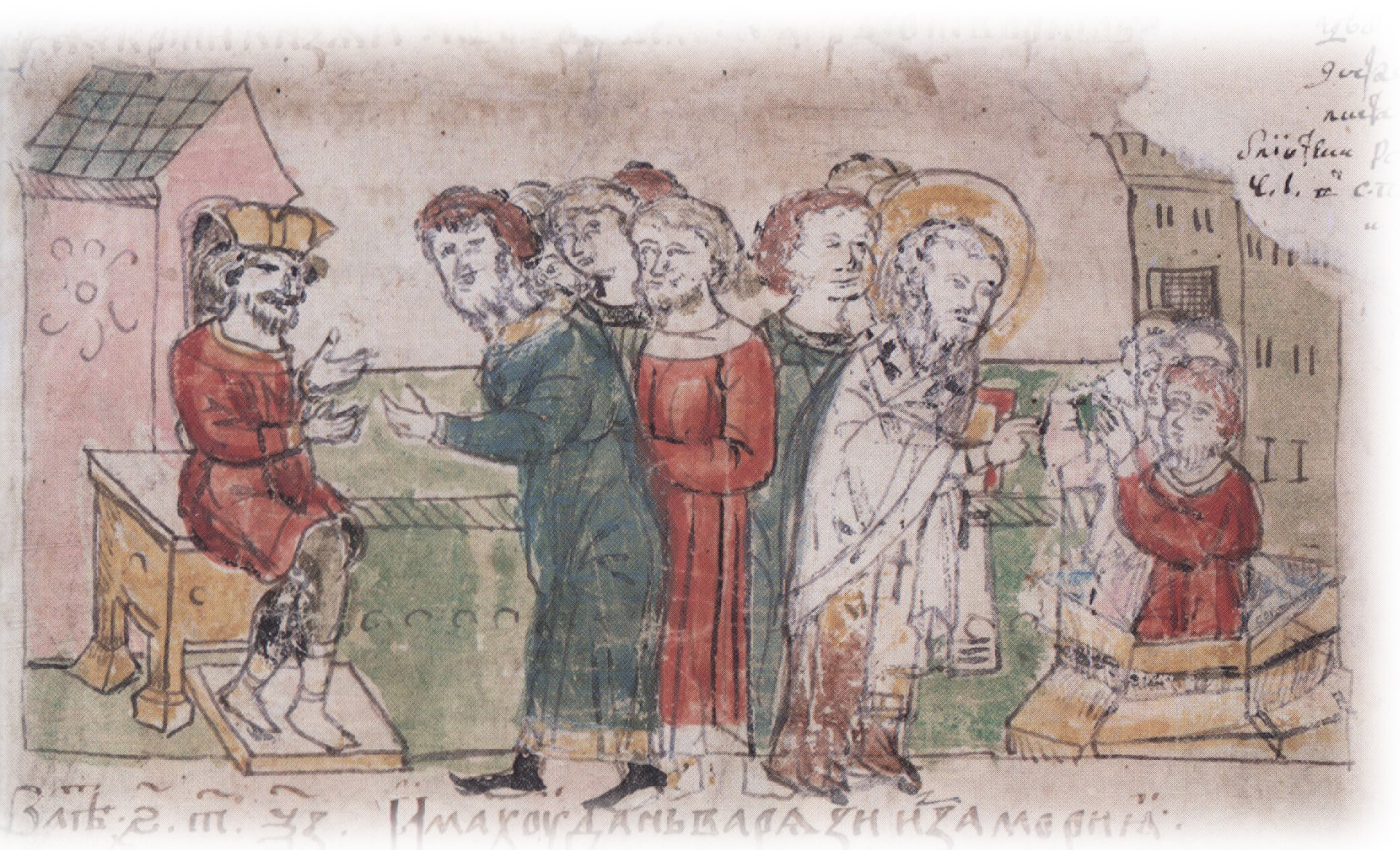 Тайное погребение Владимира Святославича, умершего в Берестове: спуск его тела на землю на ковре между разобранными клетьми здания; положение тела Владимира в мраморный гроб в церкви Святой Богородицы.