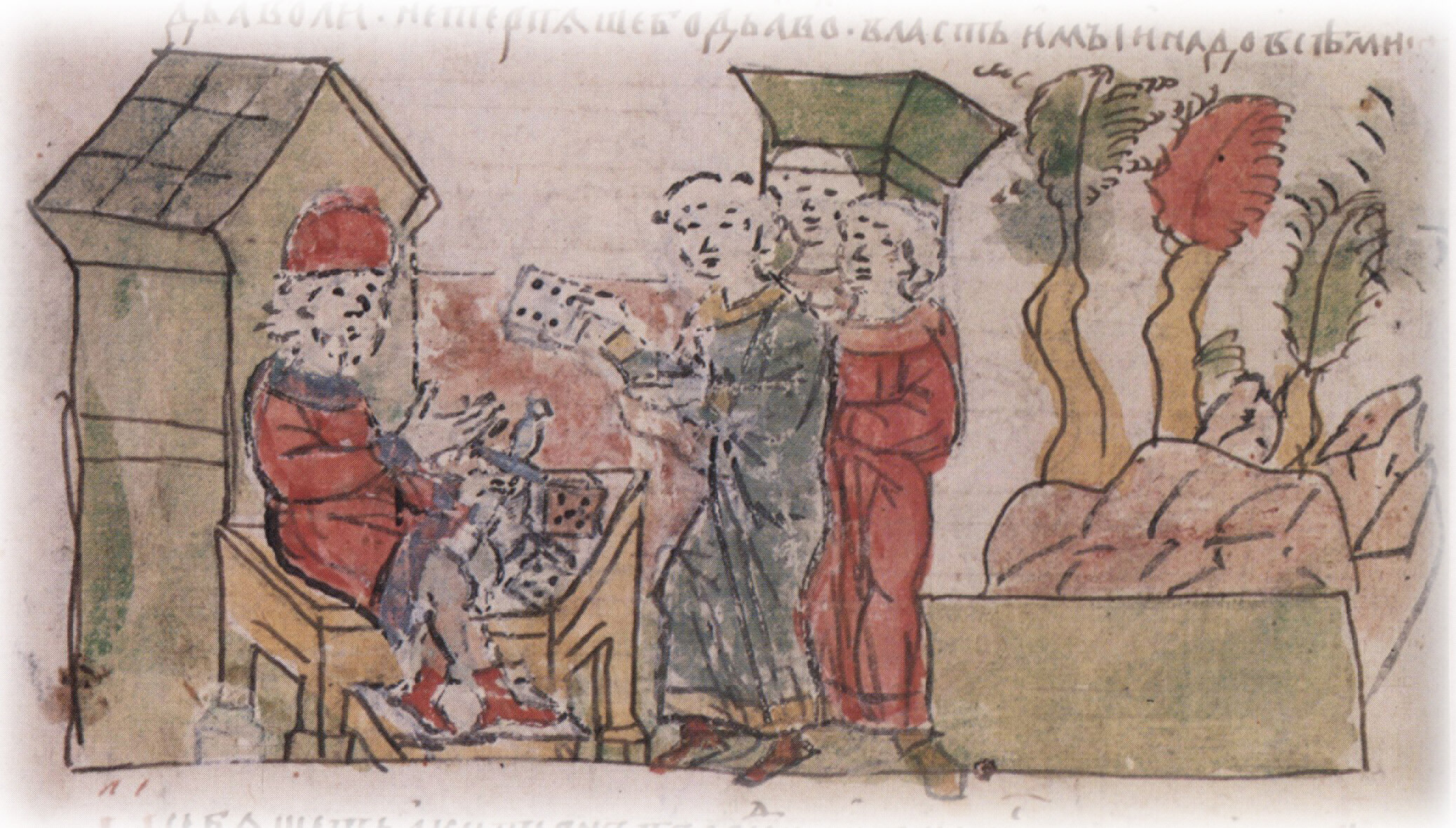Тайное погребение Владимира Святославича, умершего в Берестове: спуск его тела на землю на ковре между разобранными клетьми здания; положение тела Владимира в мраморный гроб в церкви Святой Богородицы.