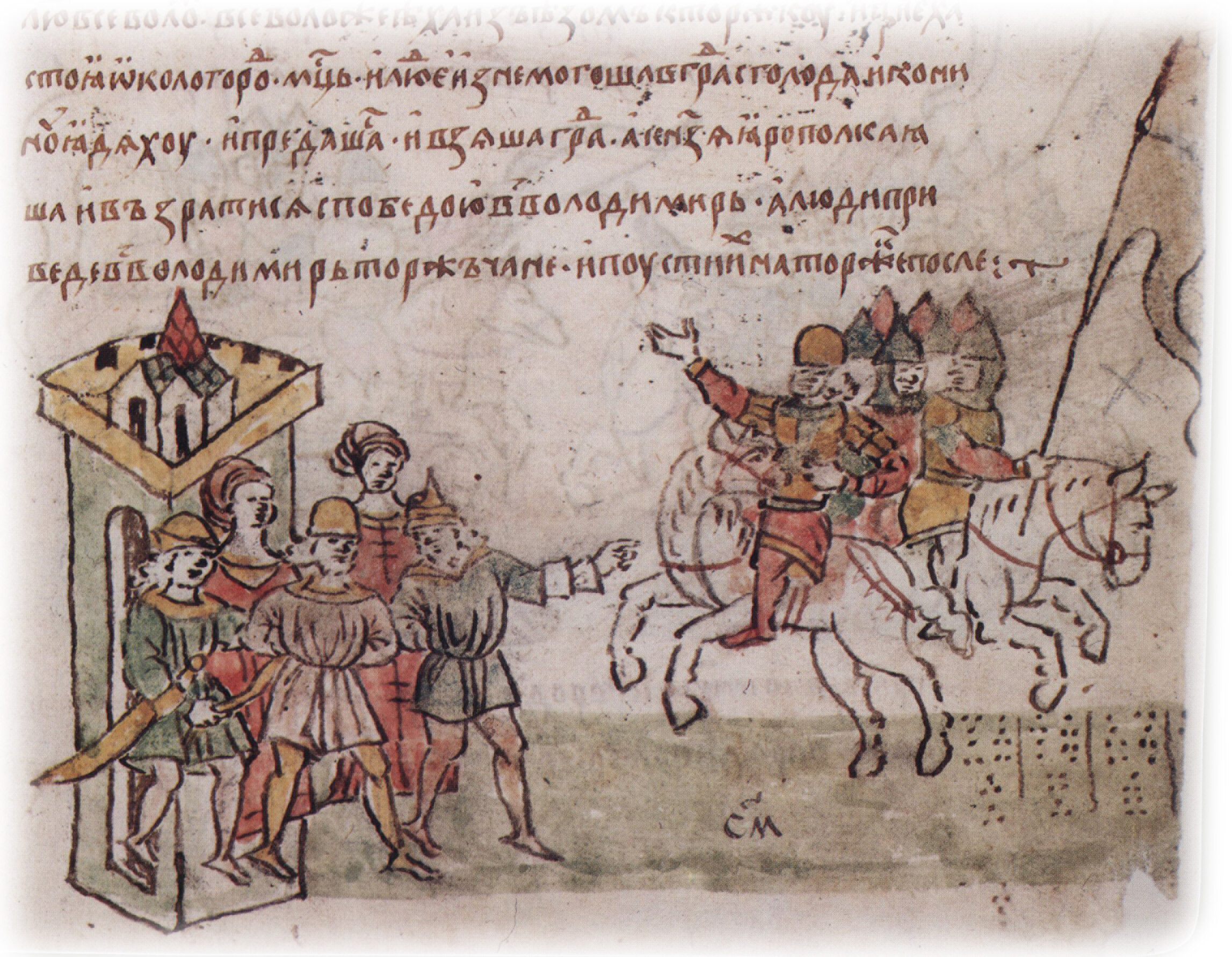 Рисунок "мастера В" — трость; последующая прорисовка — перо. Пририсовка сбруи, стремени и навершия древка знамени — перо.