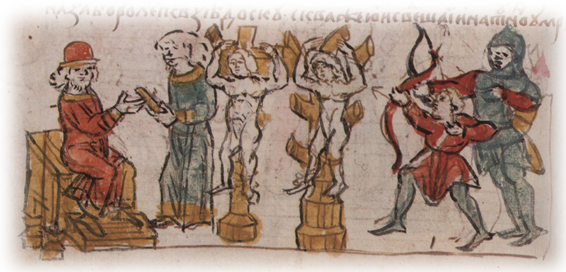 Рисунок "мастера Б" — перо. Правлен (фигуры, лица, свиток, луки, столпы; забелены головы справа) "мастера В" — кисть.