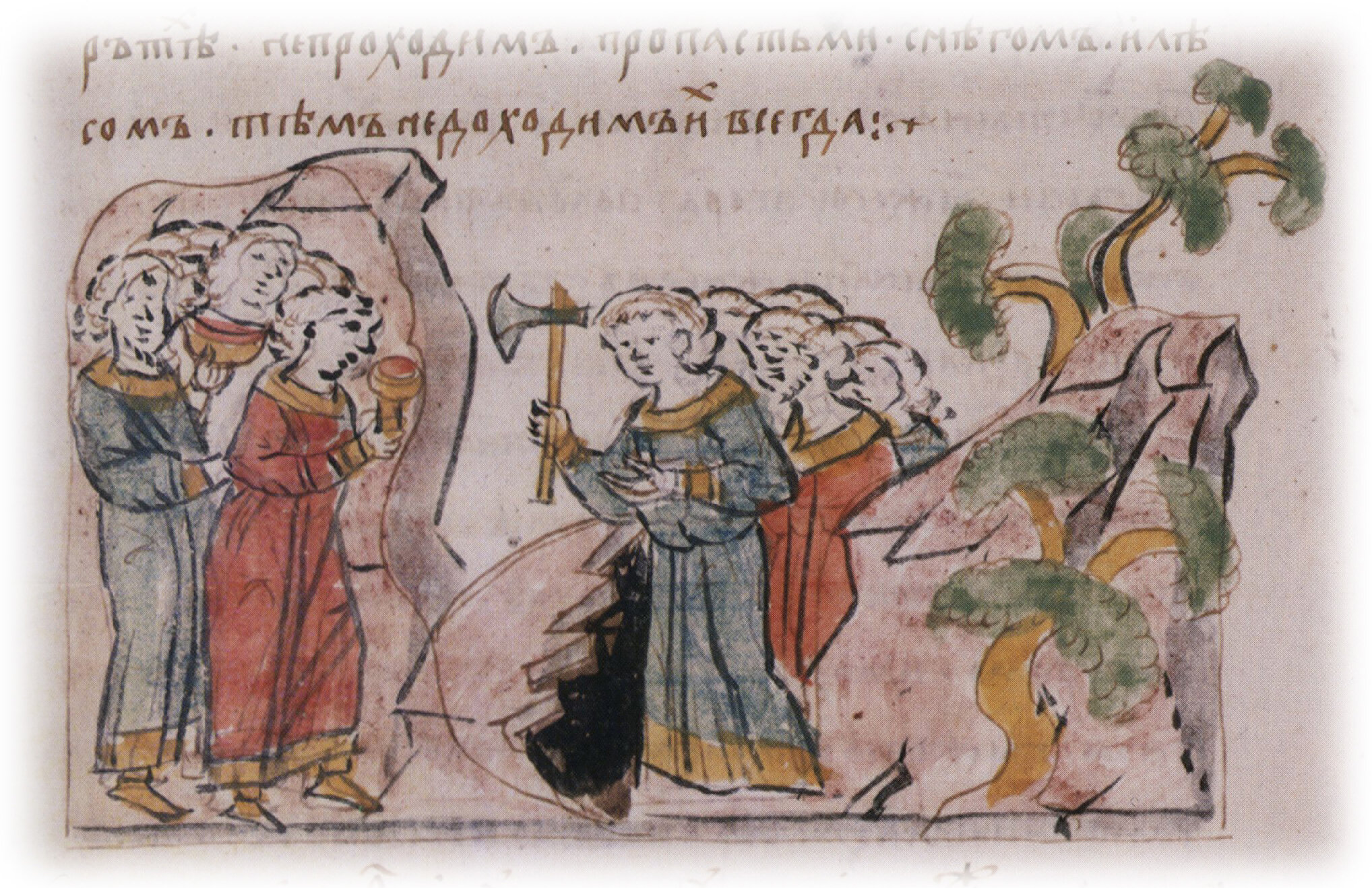 Рисунок "мастера Б" — перо. Правлен (фигуры, лица, топор, чаша, кубок, скала, пещера, лещадка, дерево) "мастера В" — кисть