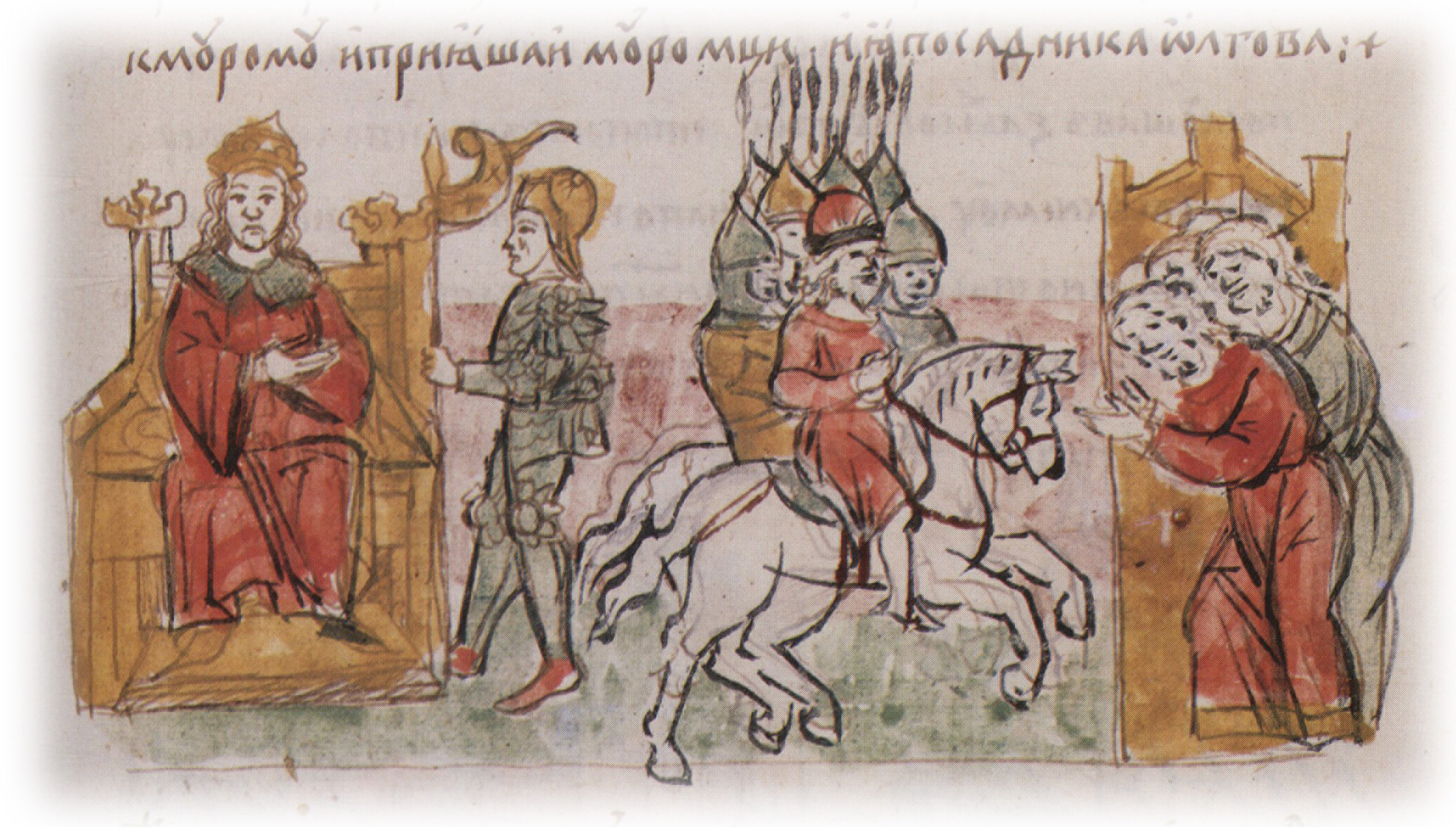 Рисунок "мастера Б" (?) — перо. Правлен (фигуры, лица, шапка, шлемы, копья, знамя, стол, лошади) "мастера В" — кисть. Позднейшая пририсовка сбруи и стремени — перо.