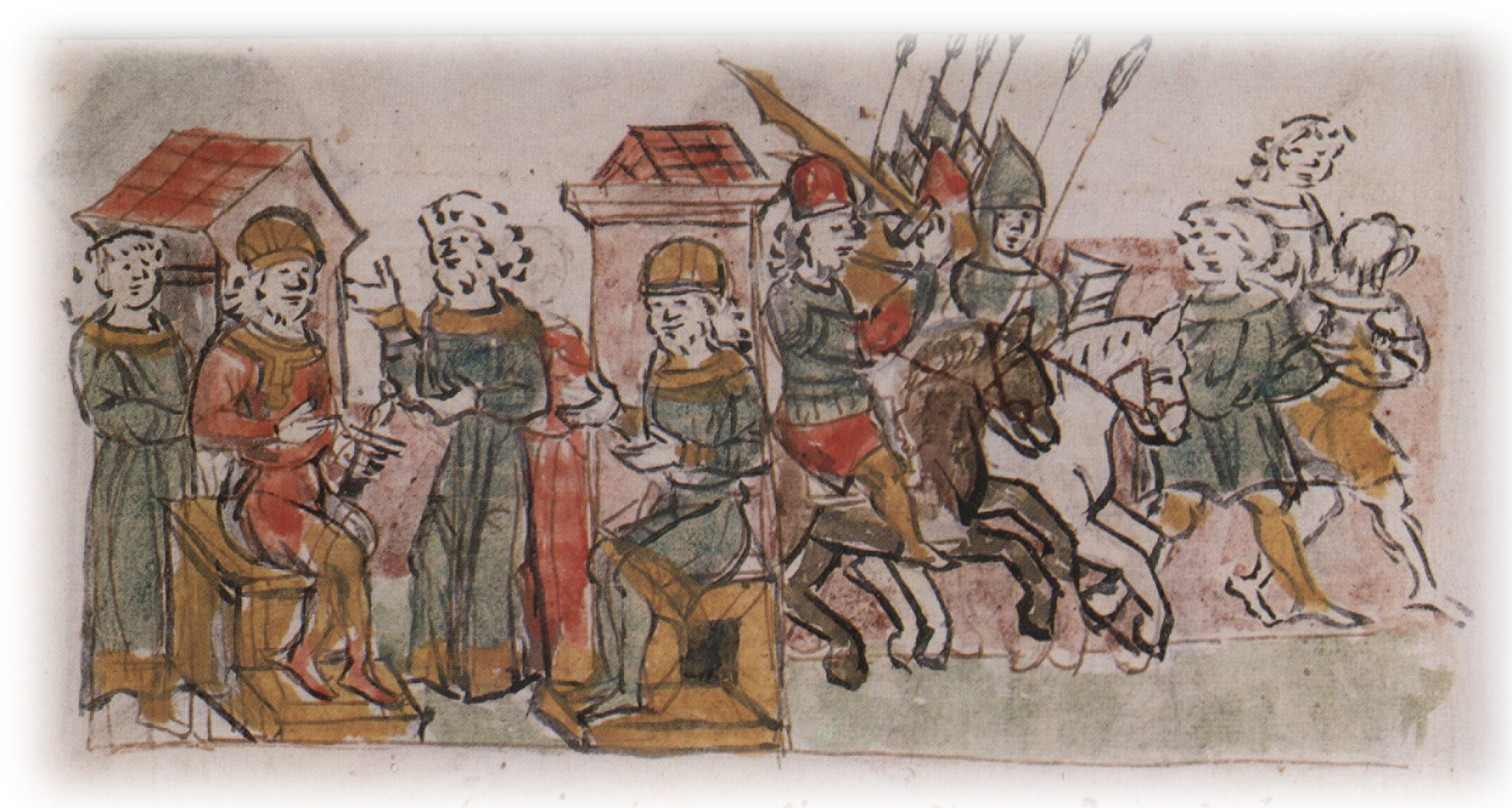 Рисунок "мастера Б" — перо. Правлен (фигуры, лица, шапки, шлемы, мечи, копья, столы, архитектура, лошади) и дополнен (фигуры и щит справа) "мастера В" — кисть. Позднейшая пририсовка сбруи — перо.