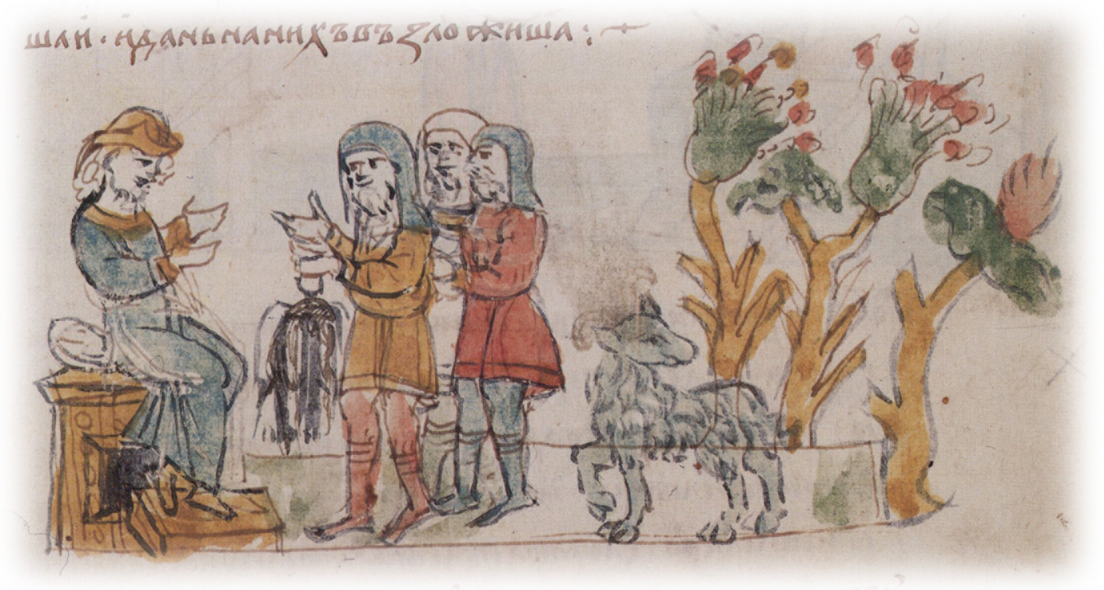 Рисунок "мастера Б" — перо. Правлен (фигуры, лица, головные уборы, круглый бунт куньих мехов, деревья) и дополнен (баран, дерево справа) "мастера В" — кисть.