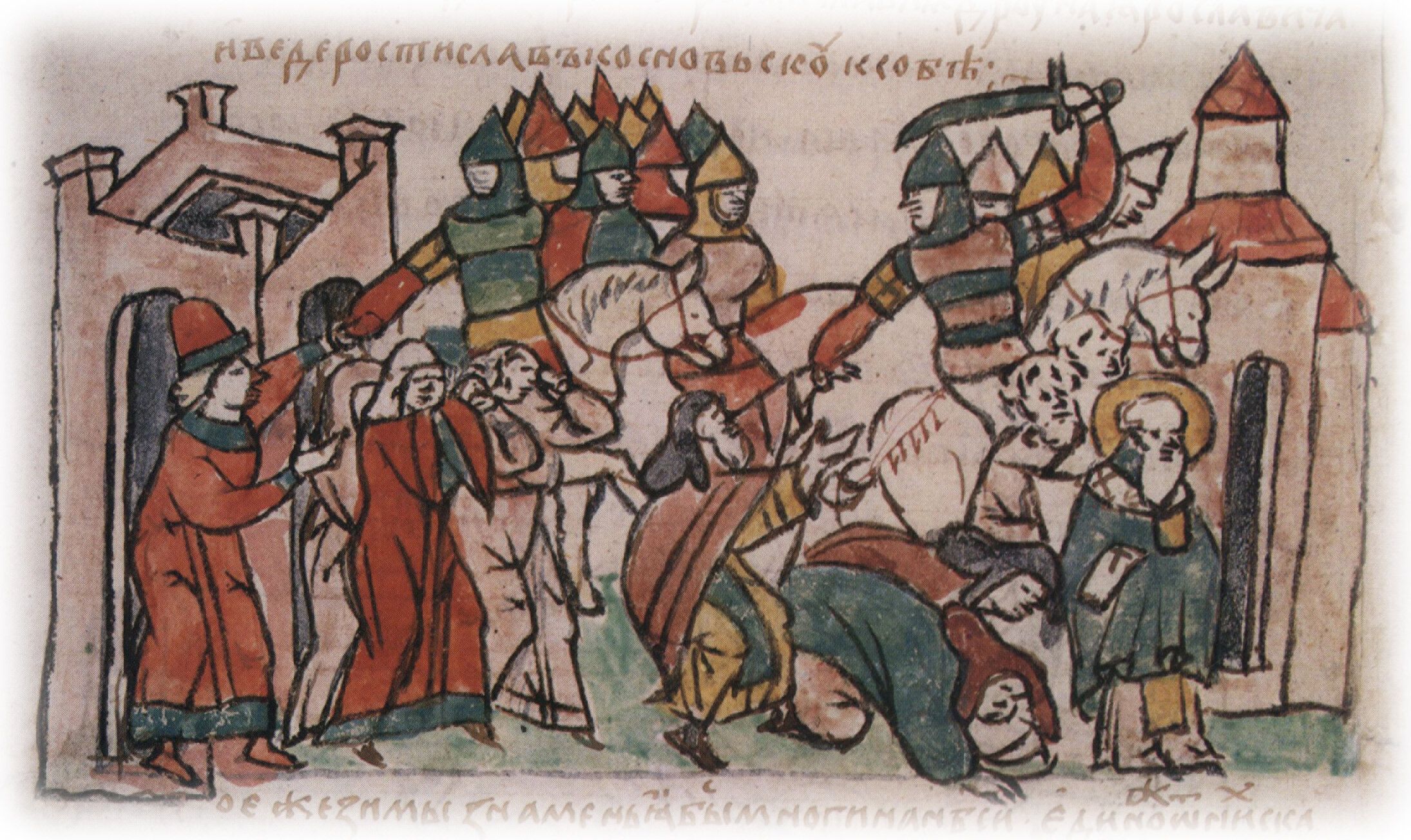 "Черници и черници старыя иссекоша, и попы старые, и слепыя, и хромыя, и слукыя, и трудоватыя, та вся иссекоша; а что черноцов инех, и черниць инех, и попов, и попадей, и кияны, и дщери их, и сыны их, то все ведоша иноплеменици в вежи к собе. Тогда же яша и Мстислава... и веде Ростислав к Сновьску к собе".